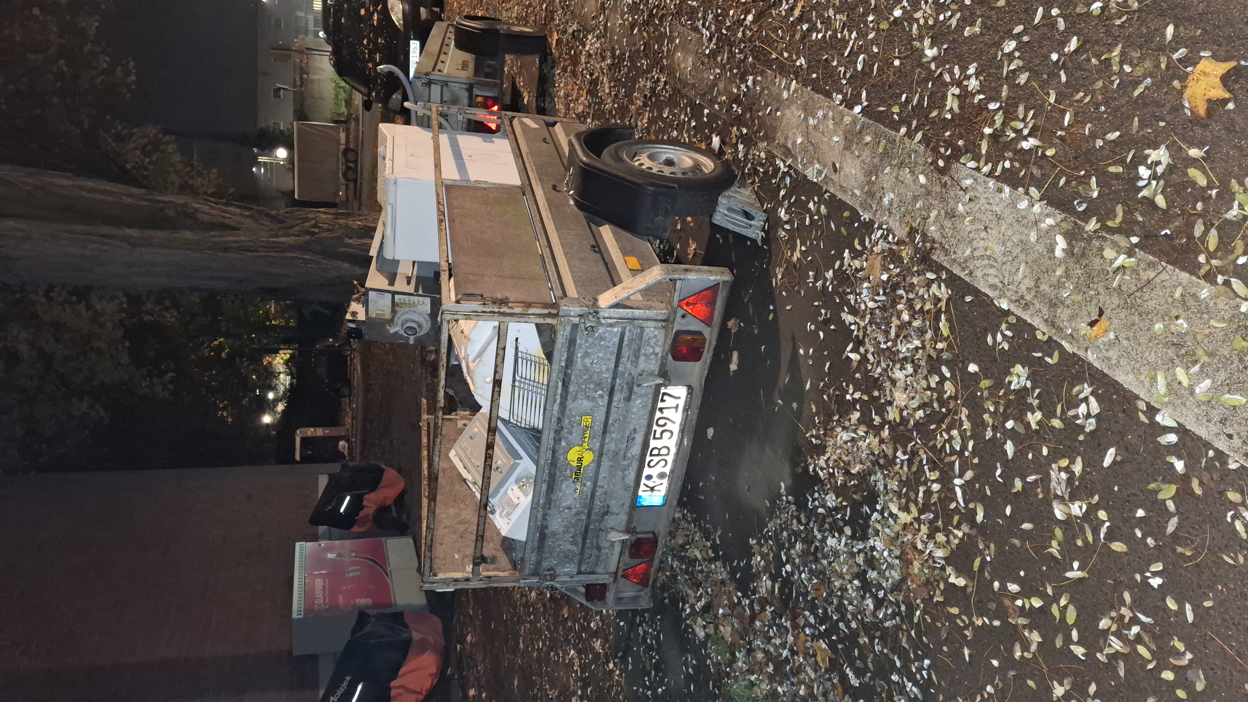 Anhänger mit Schrott beladen. Dazwischen Einkaufswagen. Stehen dort seit Monaten.
