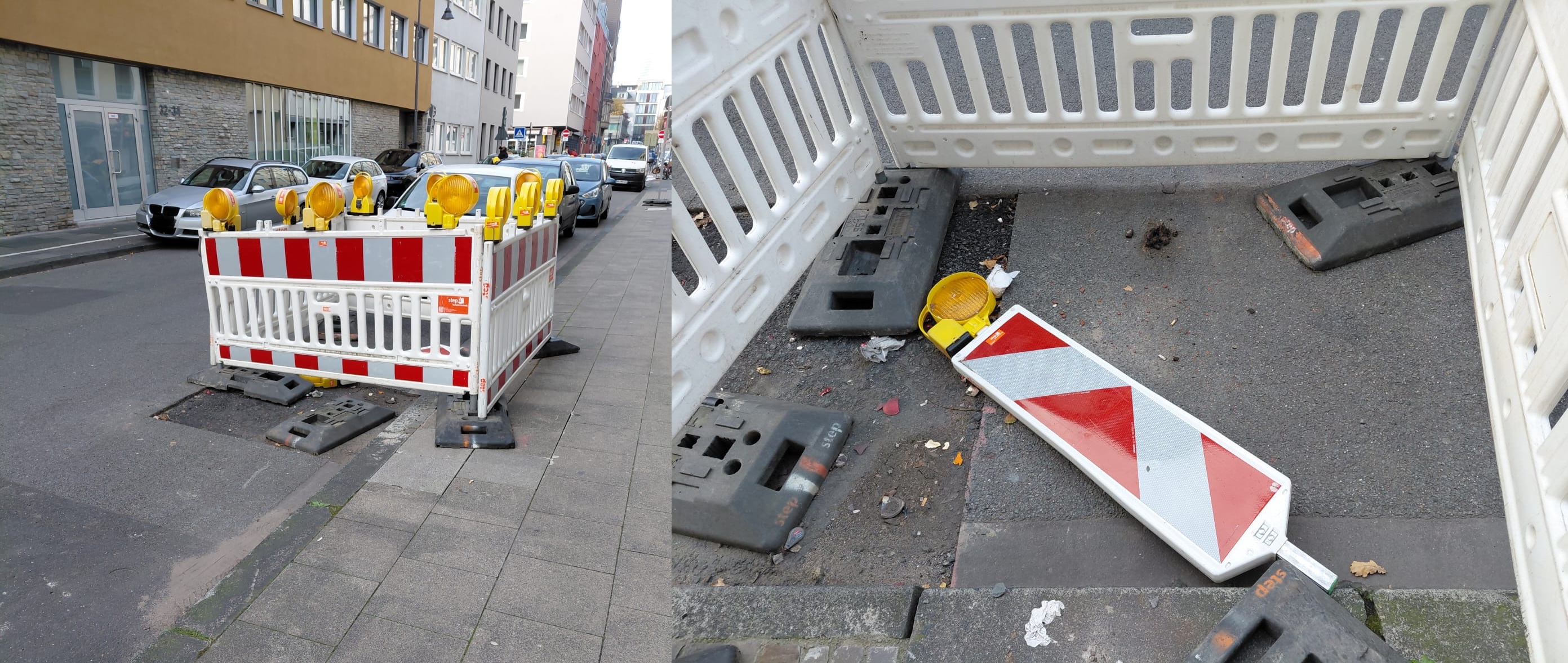 Nicht vollständig fertiggestellte Fahrbahndecke inkl. Absperrbaken ggü. Machabäerstr. 36; vermutlich "Reste" der Fernwärmebaustelle aus Frühjahr / Sommer diesen Jahres (2025).