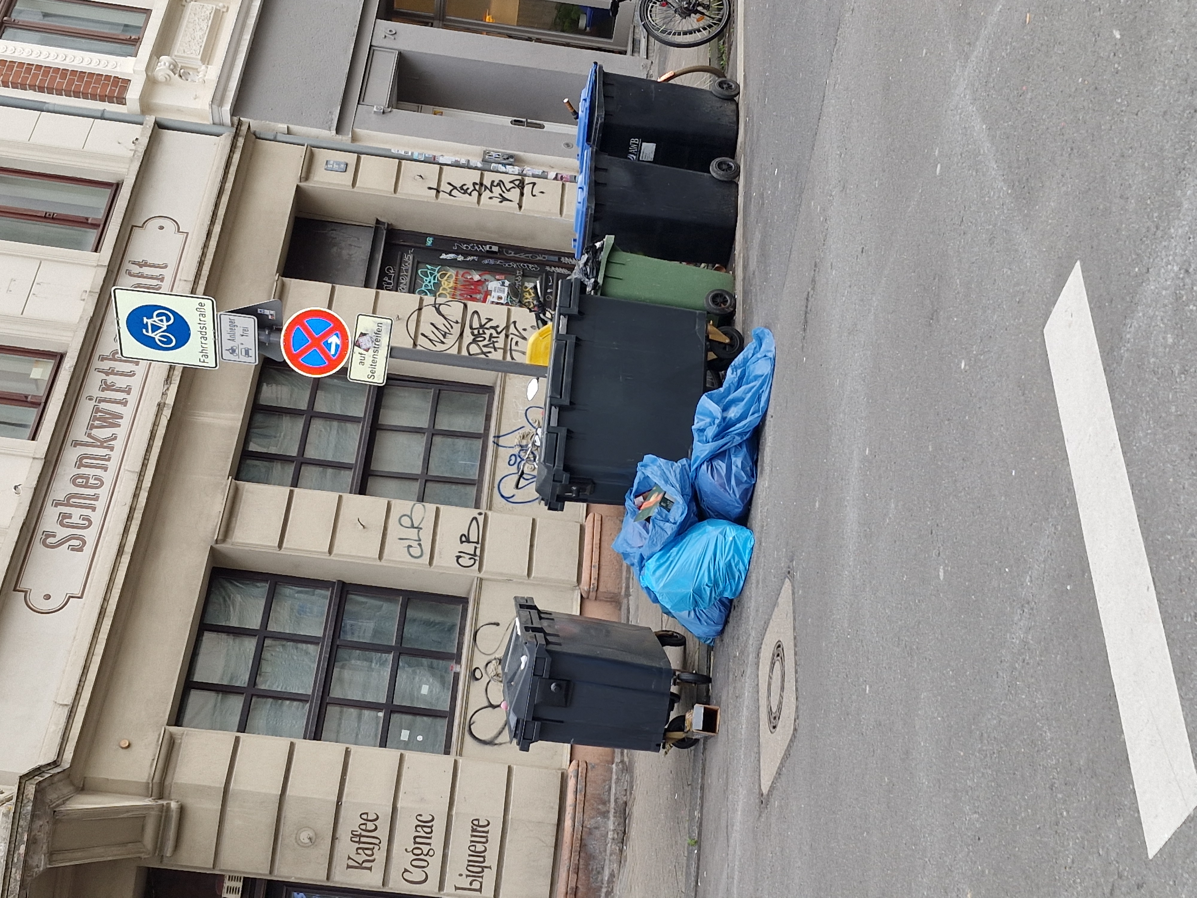 Wilder müll seit mind. 2 Wochen. Tonnen wurden von der awb nicht zurück an doe zuständigen häuser gebracht . Keiner vermisst diw Tonnen.