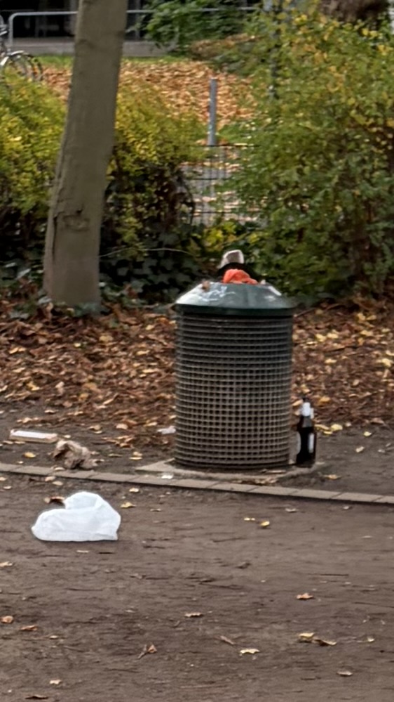 Etliche Mülleimer am Clarenbach-Kanal quillen über. Ein Problem sind vor allem die Eimer mit Schwingdeckel, die durch jeden Kaffeebecher verstopfen. Ich hoffe, hier findet sich bald eine andere Lösung gegen Krähen.