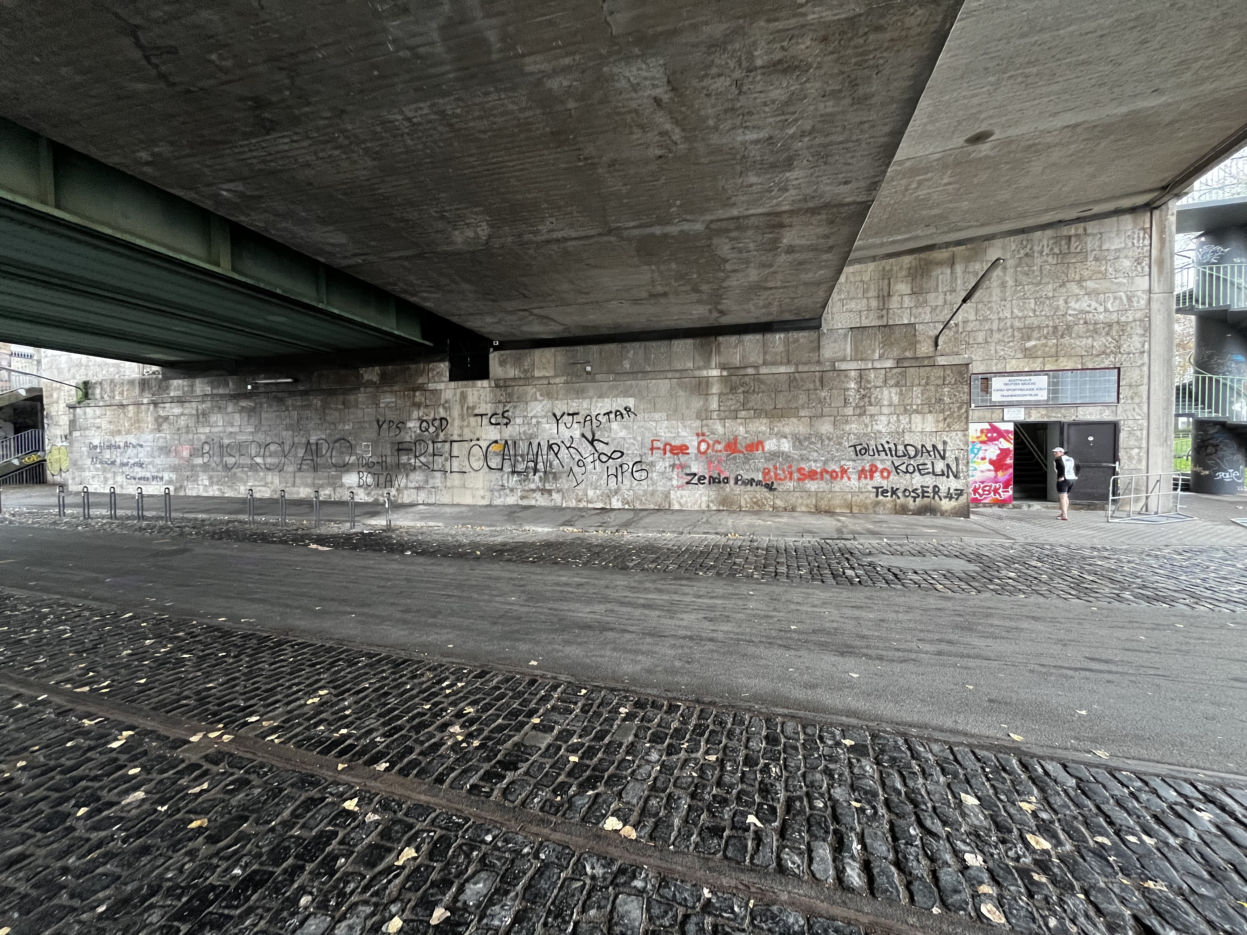 Also ich bin auch für die Freilassung von Abdulla Öcalan, aber ich hoffe die Stadt Köln beseitigt diese neuen Graffiti-Schäden an der Deutzer Brücke und Umgebung auf Kosten des Veranstalters der Demo vom 8.11.2025.