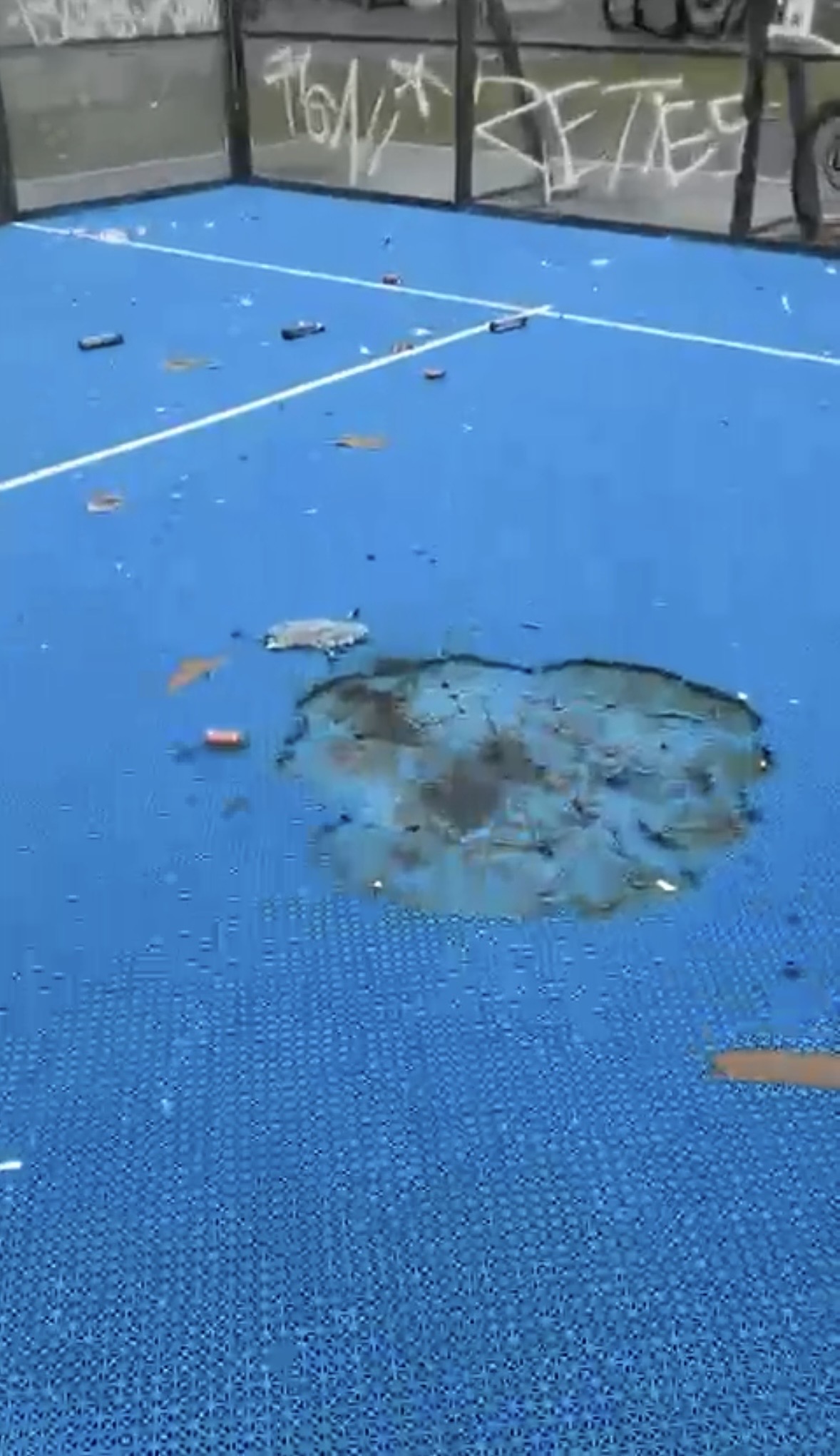 Hier wurden Verbrennungen am Bodenbelag verursacht, wodurch der Platz nicht mehr bespielbar ist.