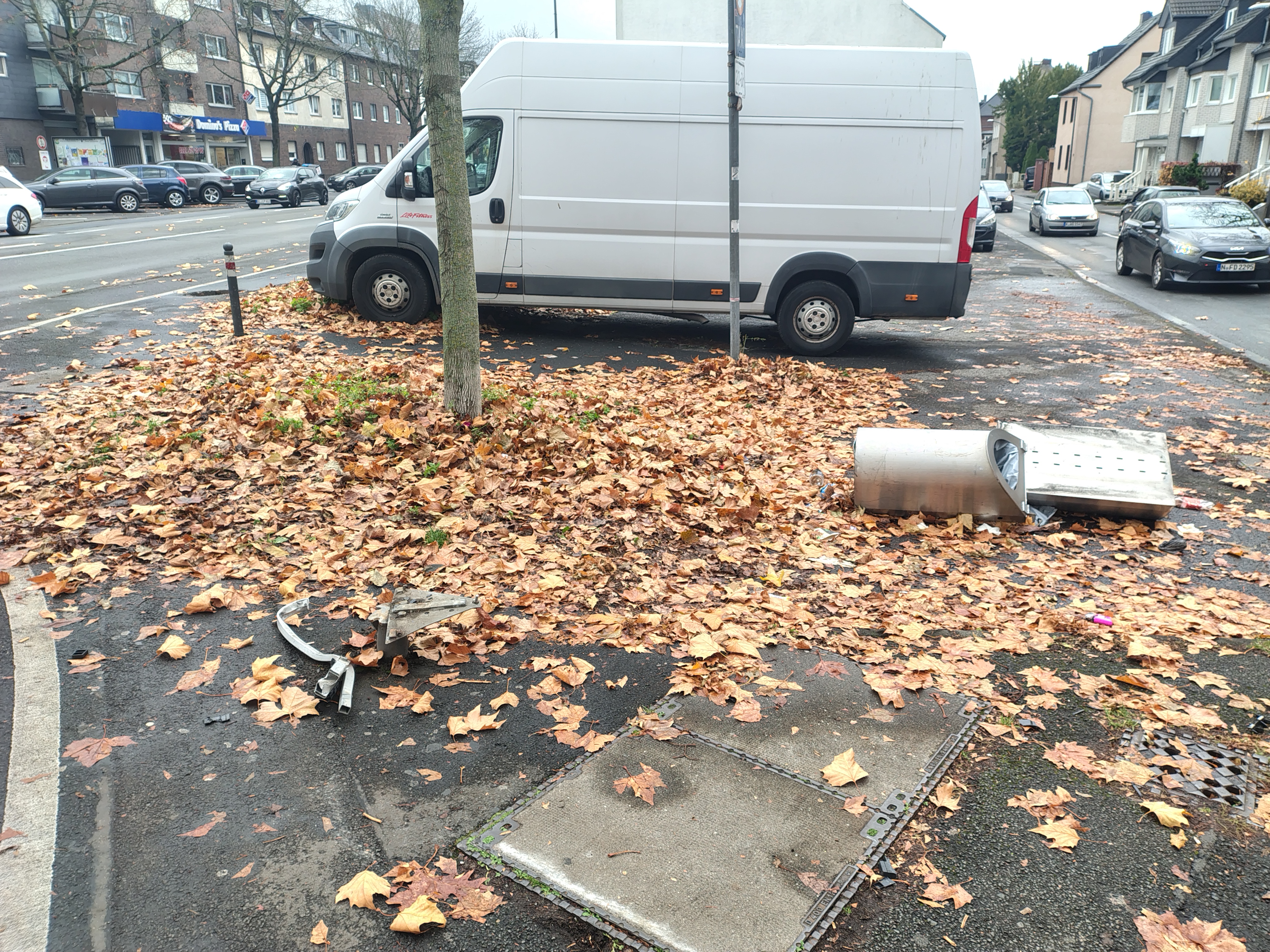 Mir ist ein umgefahrener Abfalleimer an der Ecke Schnellweider Str. / Maria-Himmelfahrt-Str. / Bergisch-Gladbacher Str. aufgefallen.