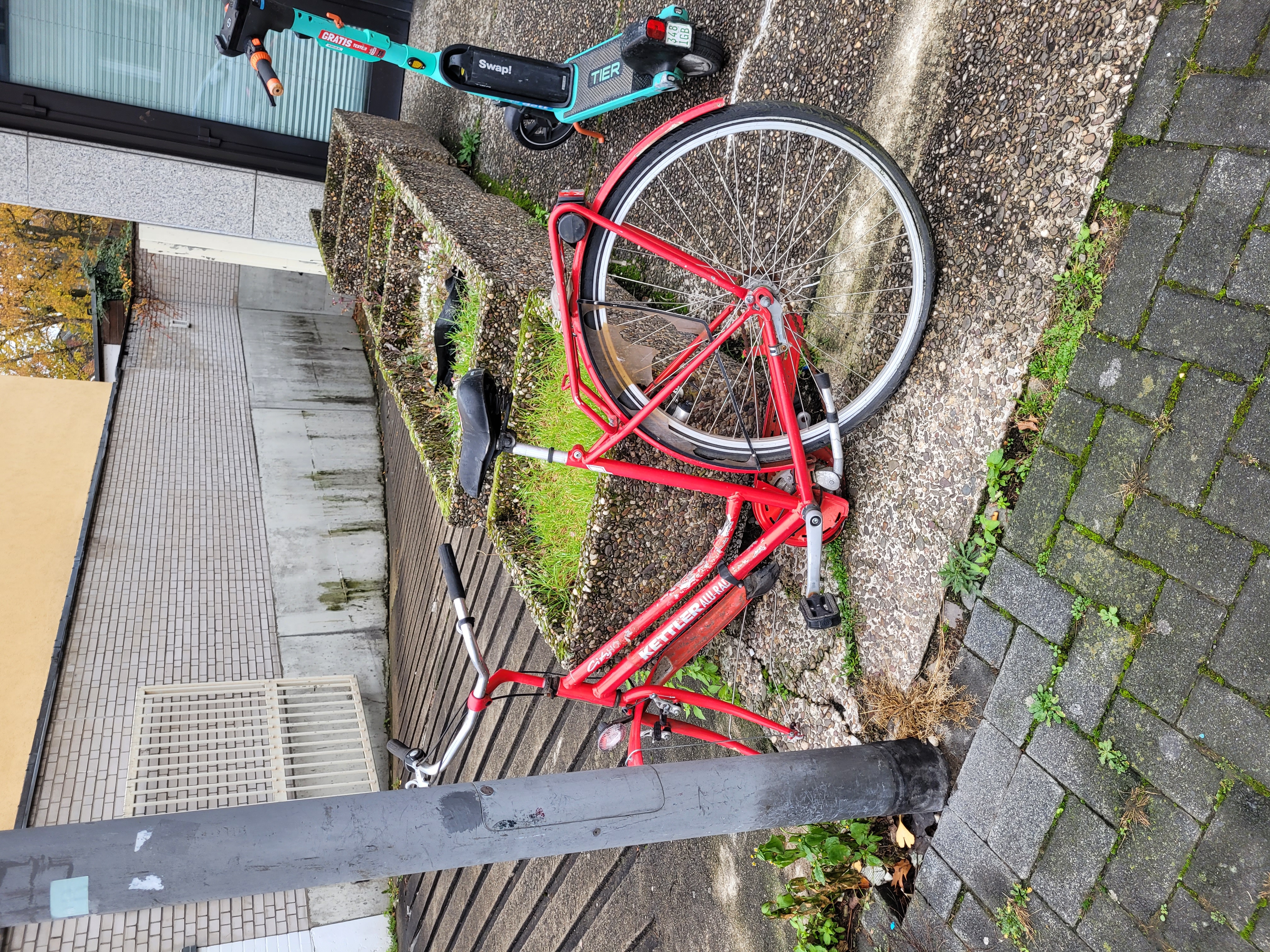 Rotes Fahrrad, welches einen gebrochenen Rahmen hat und kein Vorderrad mehr besitzt.