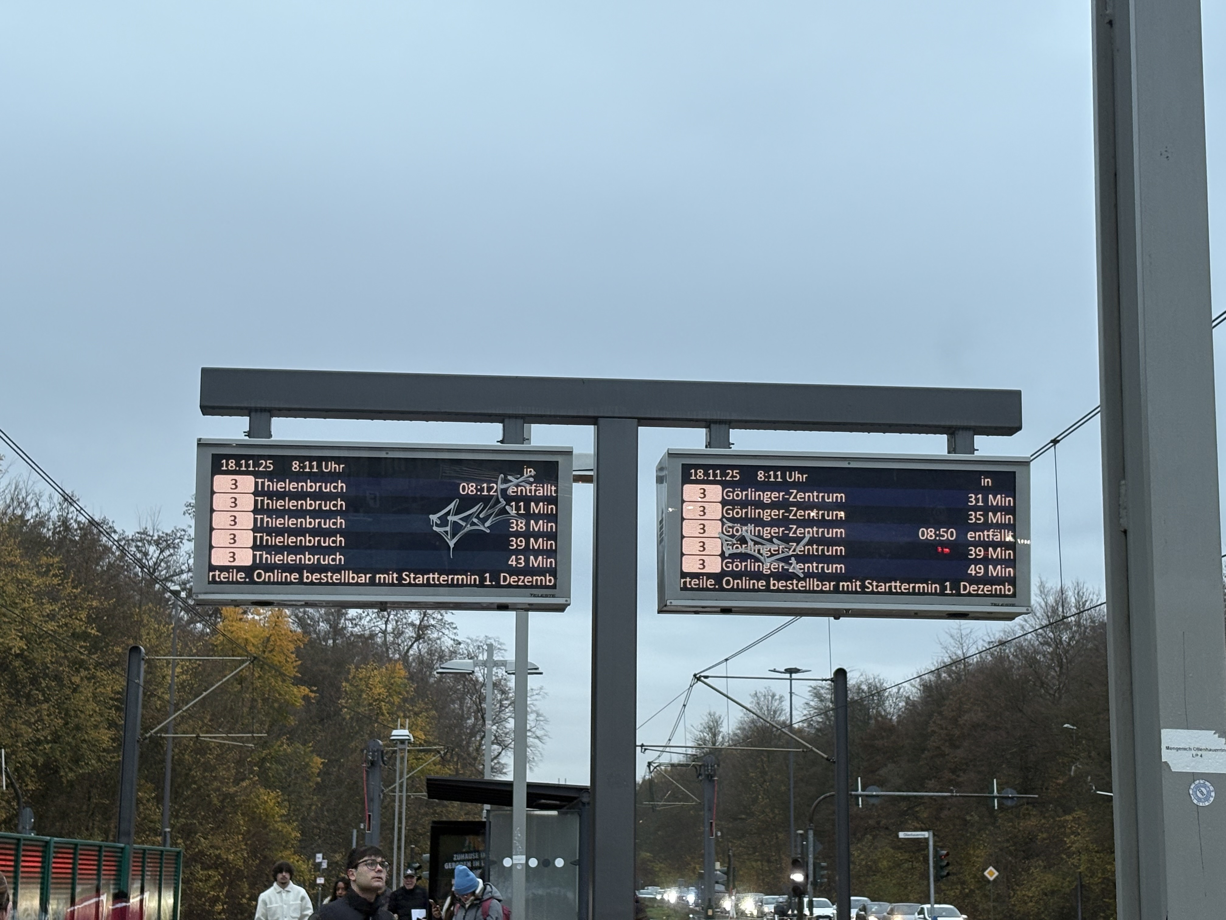Auf dem Display der KVB-Straßenbahn wurden Graffiti angebracht, wodurch die Serviceinformationen unleserlich geworden sind. Ich würde mich über eine umgehende Reinigung freuen.