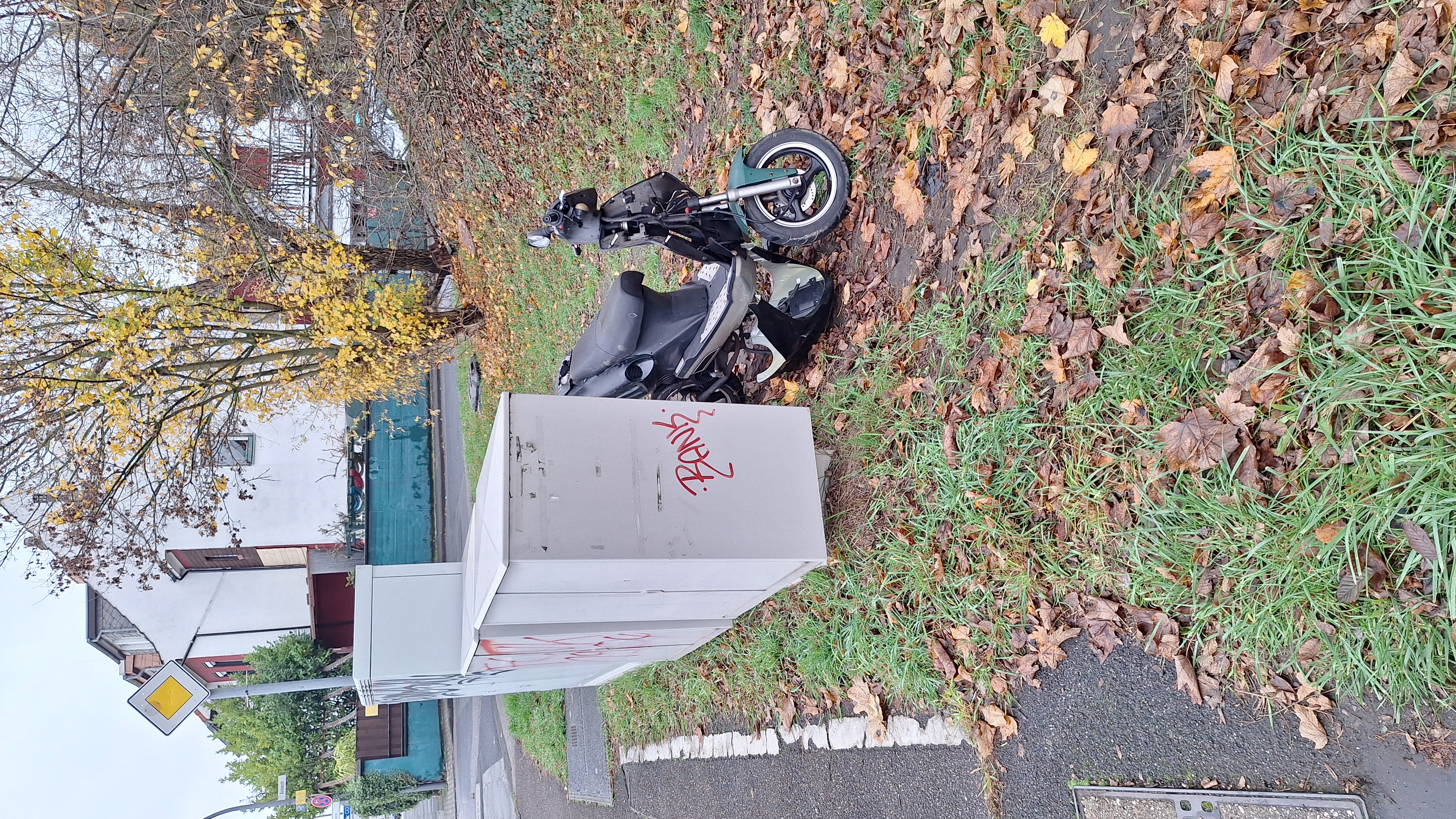 Ein Schrott-Roller steht wie auf dem Bild zusehen versteckt an der Strasse, ist komplett zerstört. Ob Restkraftstoffe/Öl auslaufen kann ich genau sagen. Der Roller stand vorher schon wochenlang in der angrenzenden Annastrasse.