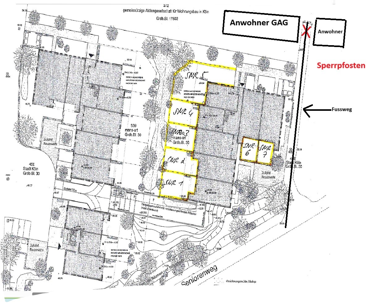 An der mit dem X gekennzeichneten Stelle befindet sich auf dem Fußweg ein herausnehmbarer Sperrpfosten (um Zugänglichkeit für AWB und Rettungsdienste zu gewähren herausnehmbar). Dieser ist durch unbekannte stark verbogen worden, so dass er nicht mehr herausziehbar war. Um den Weg für den Notfall frei zu machen wurde dieser durch Anwohner mittels eines Hebels herausgeholt und im Bereich von Haus 20 deponiert. Der Pfosten muss dringend erneuert werden.
