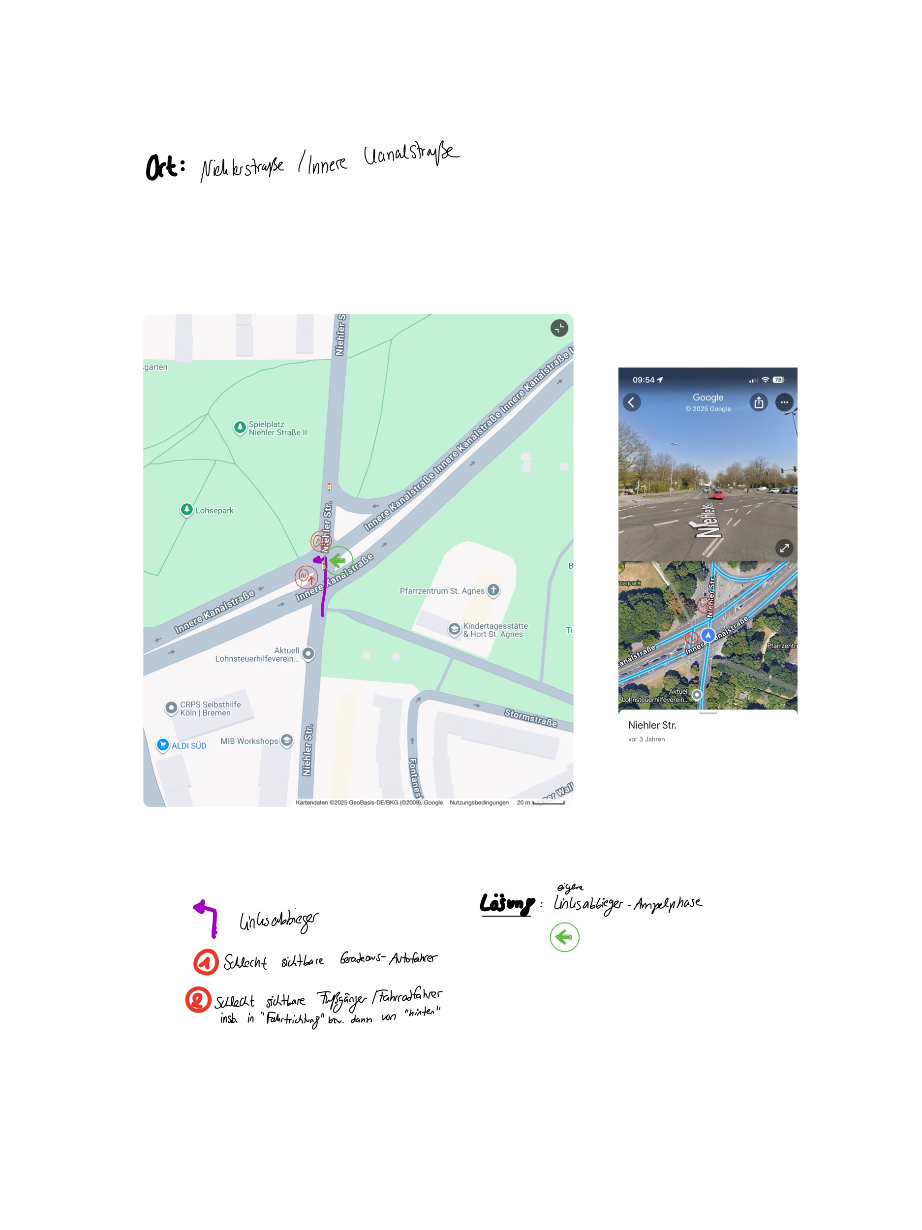 Die Kreuzung ist schlecht einsehbar. Sowohl die gegenüberliegende Geradeausspur als auch der Fußgänger-Überweg sind von der Linksabbiegerspur nicht gut zu überblicken. Das ist insb. für die Fußgänger/Fahrradfahrer gefährlich. Siehe Zeichnung im Anhang.