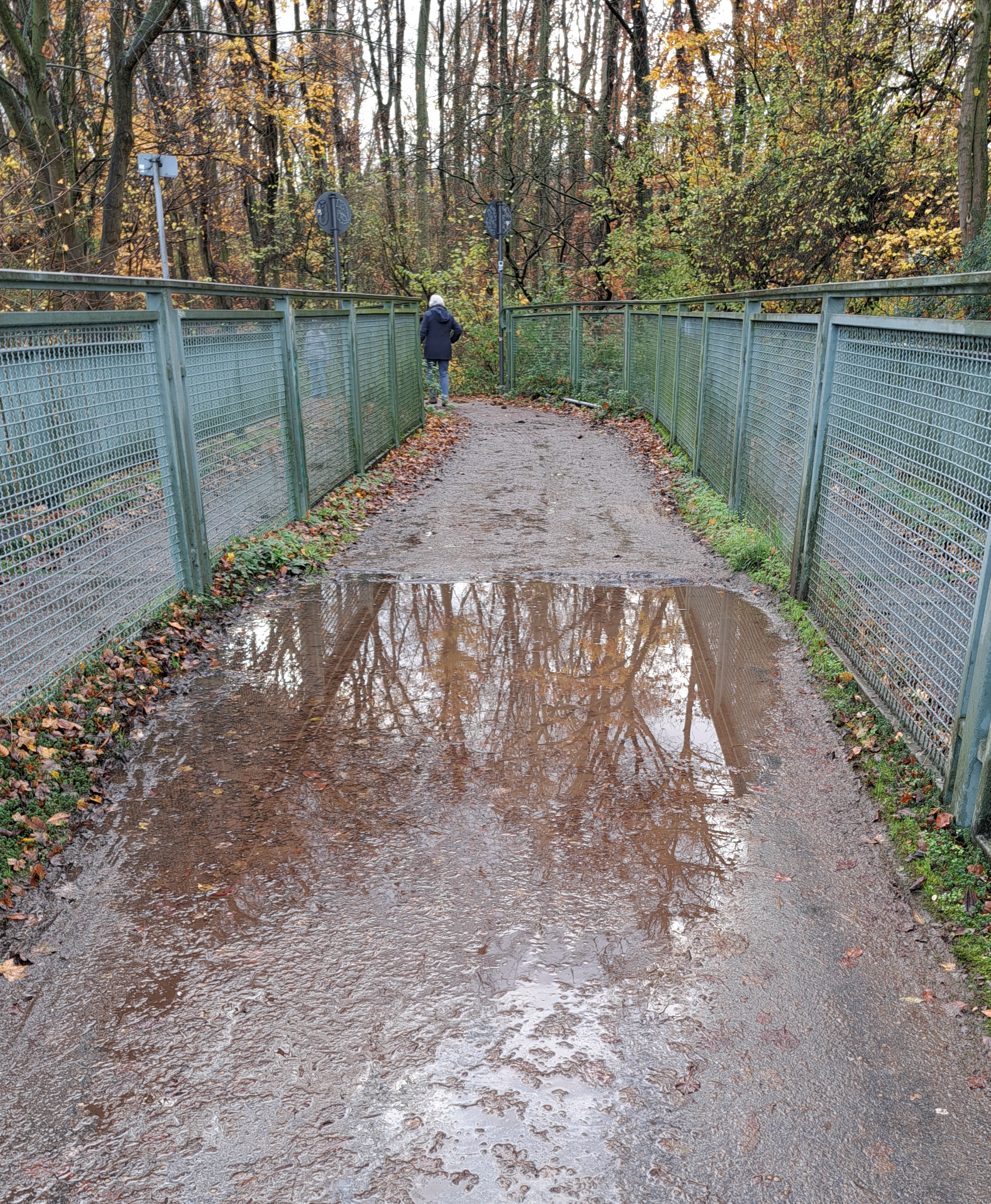 Der Fußweg über die Brücke der A4/Stadtautobahn in die Merheimer Heide ist bei längerem Regen sehr schlecht passierbar.