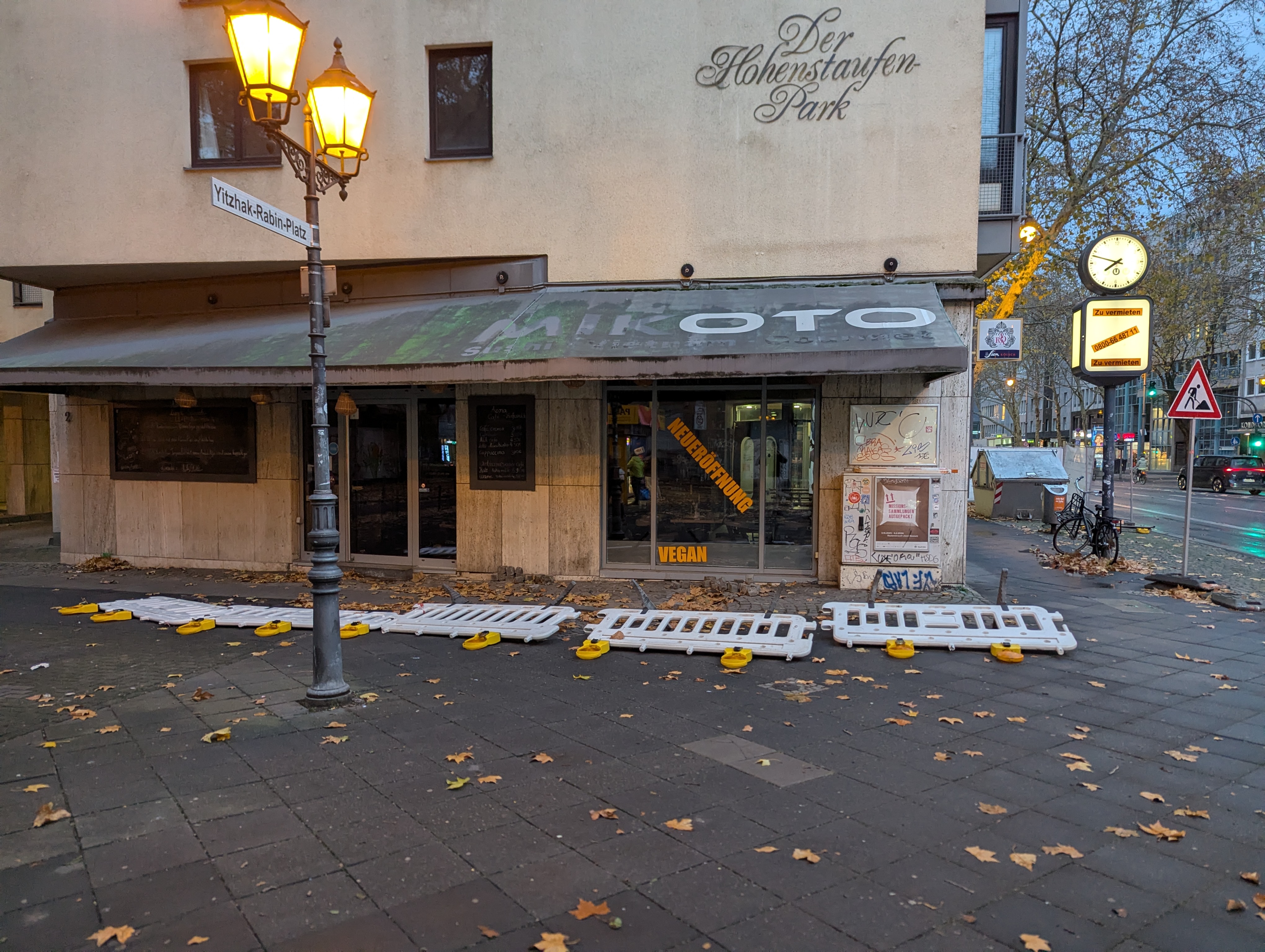 Absperrgitter liegen nutzlos auf dem Platz. Bitte wegräumen! Neu Straßenbaustellen Hohenstaufenring 55 50674 Köln Deutschland Statusvermerke Das Anliegen wurde erstellt. Neu Mi., 19.11.2025 - 13:55