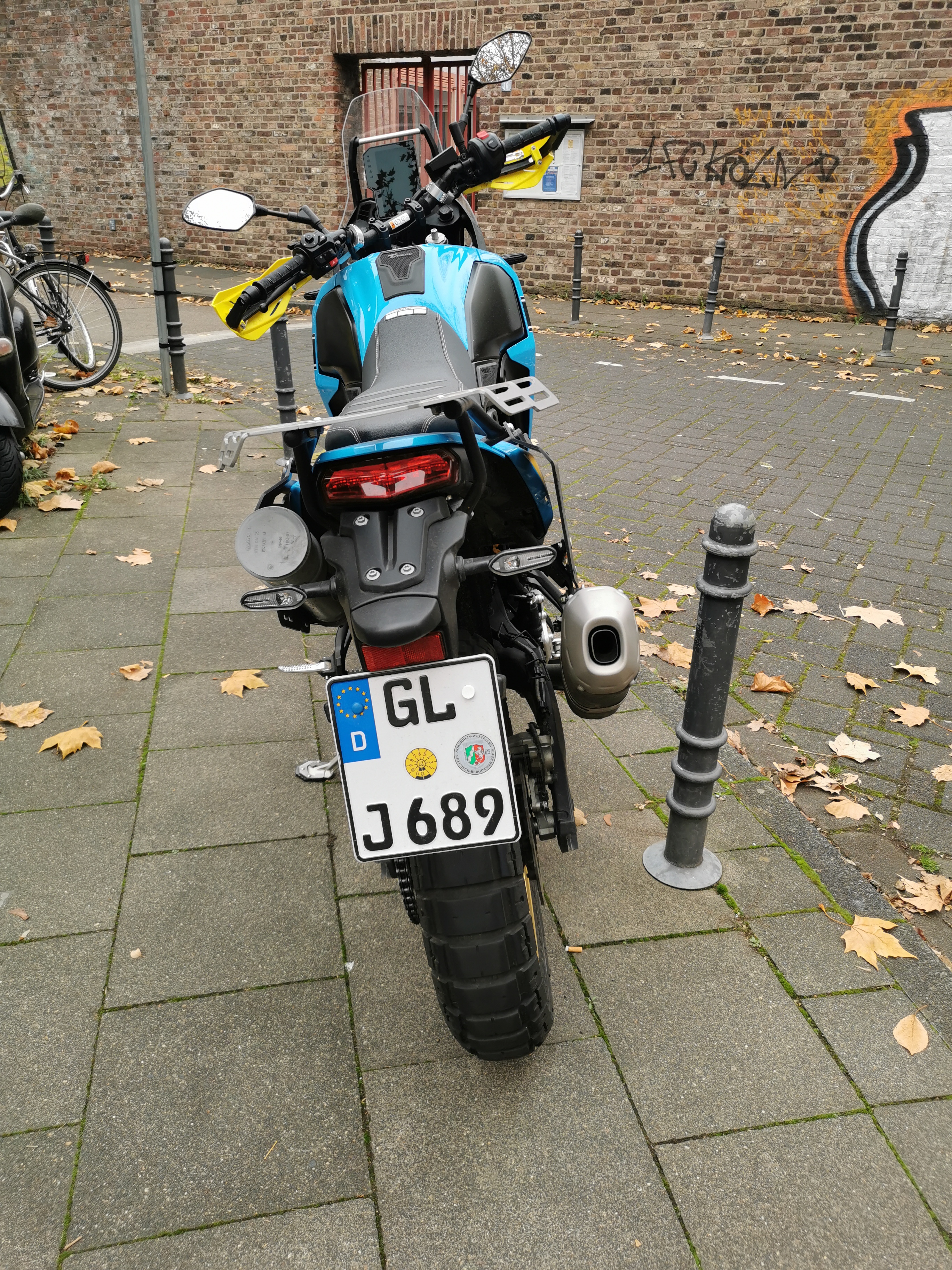 Das Motorrad steht seit Wochen auf dem Gehweg Am Pantaleonsberg, Ecke Trierer Str. Vor dem Küchenstudio.