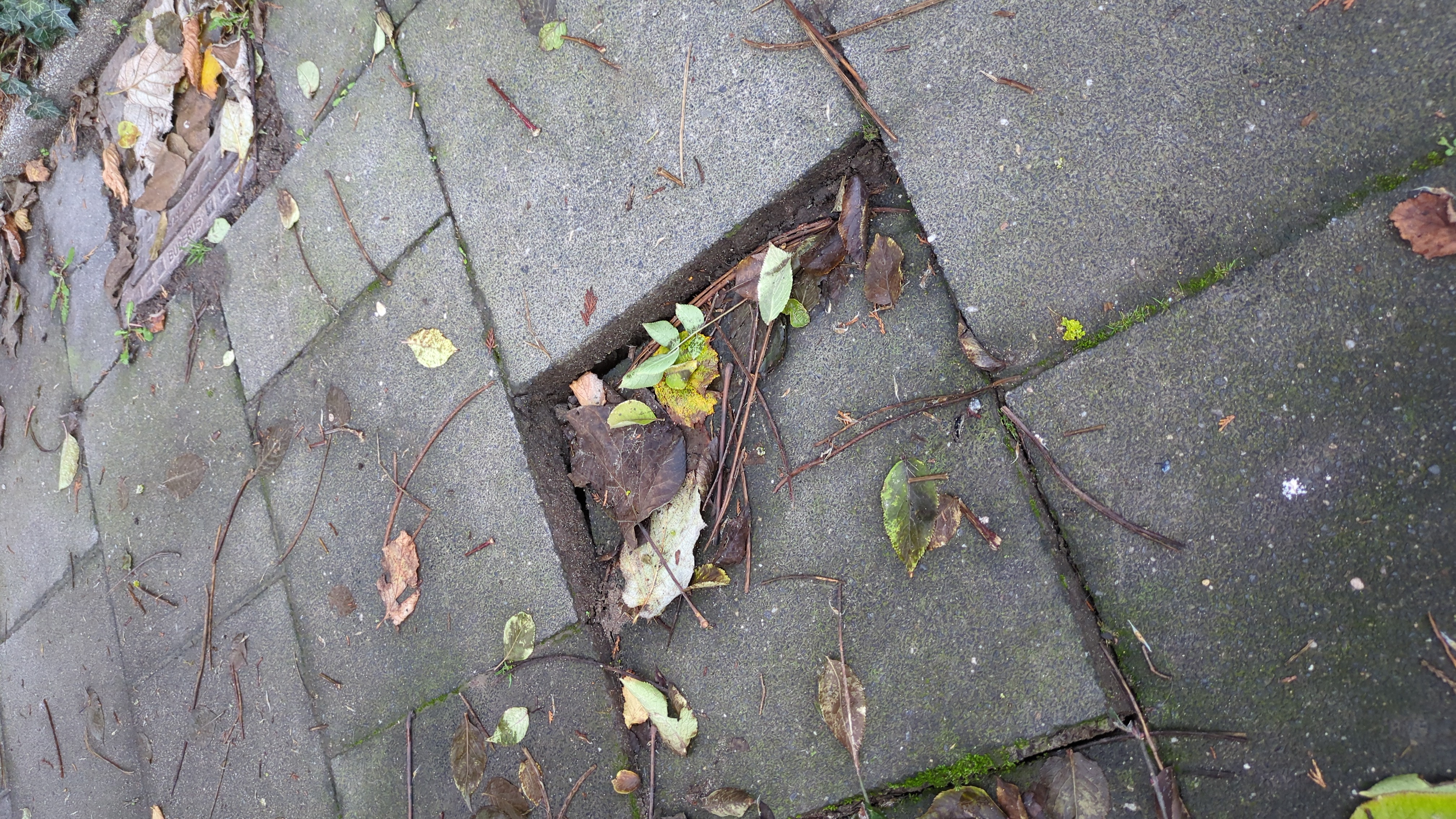 Eine Bodenplatte ist stark abgesunken und steht schräg.