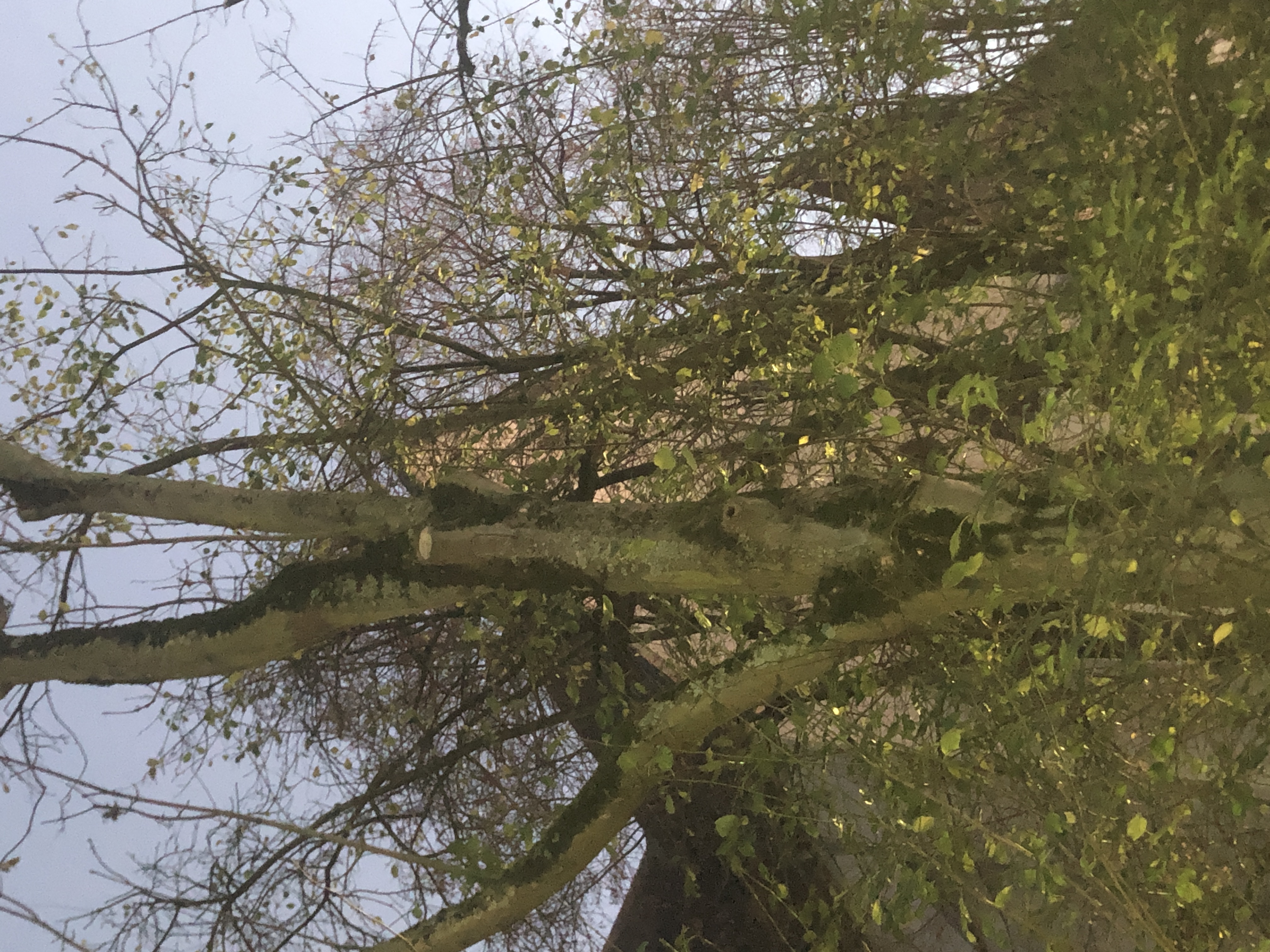 Rechts davon steht ein Ahorn-Baum und ein vierstämmiger Mirabellen-Baum, die beide viel Totholz in ihren Ästen haben und ggf. durch Schnee schwer werden und abbrechen - oder durch Winde um die Kirche weiter abbrechen… es besteht Verletzungsgefahr durch Unfälle für Fußgänger, die auf der Don-Bosco-Str. gehen zwischen Rixdorfer Str. und Tiefentalstr.