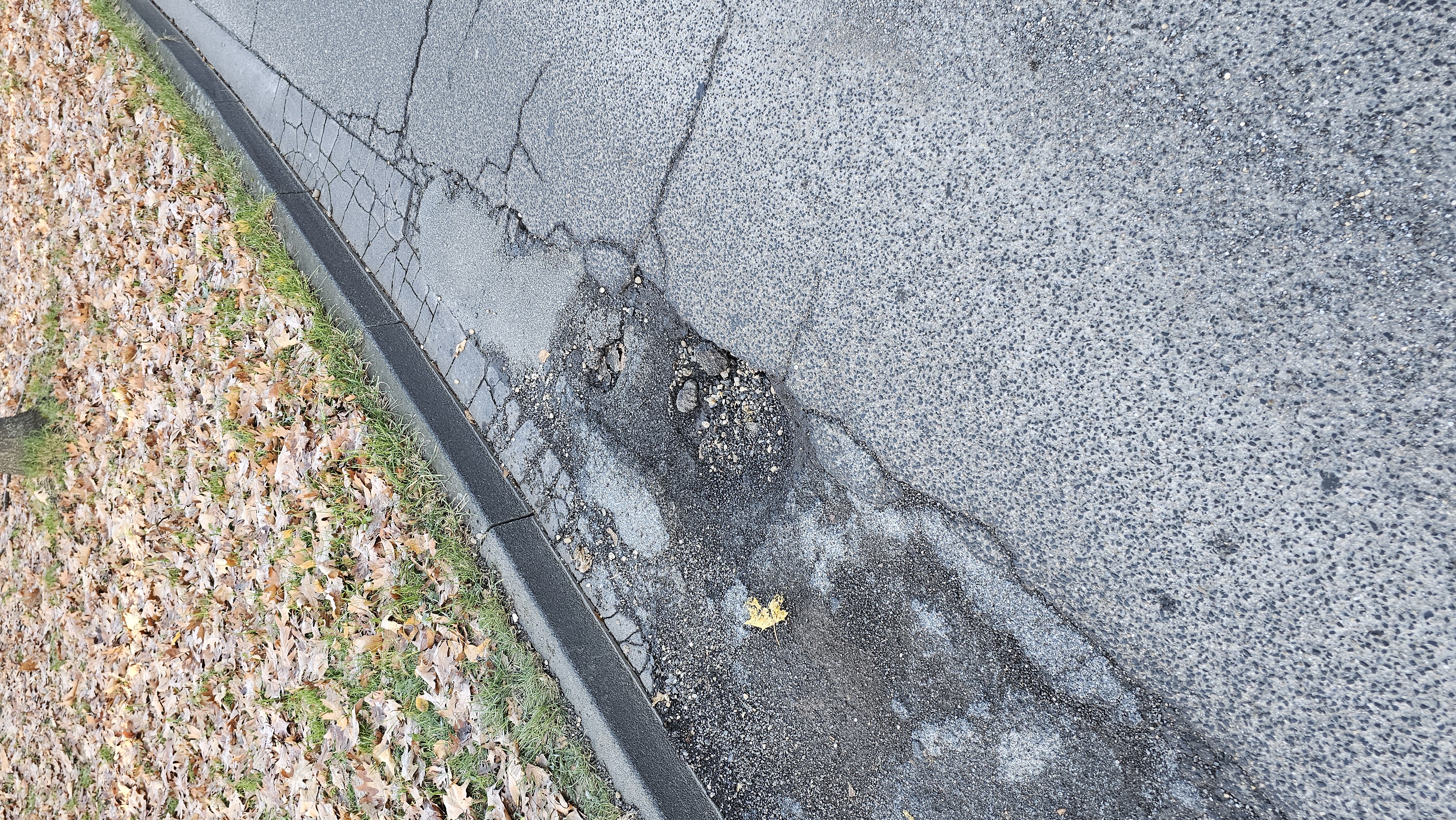 Schlagloch rechtsseitig auf der Fahrbahn. Von der Merianstraße kommend in Fahrtrichtung Tiberstraße.