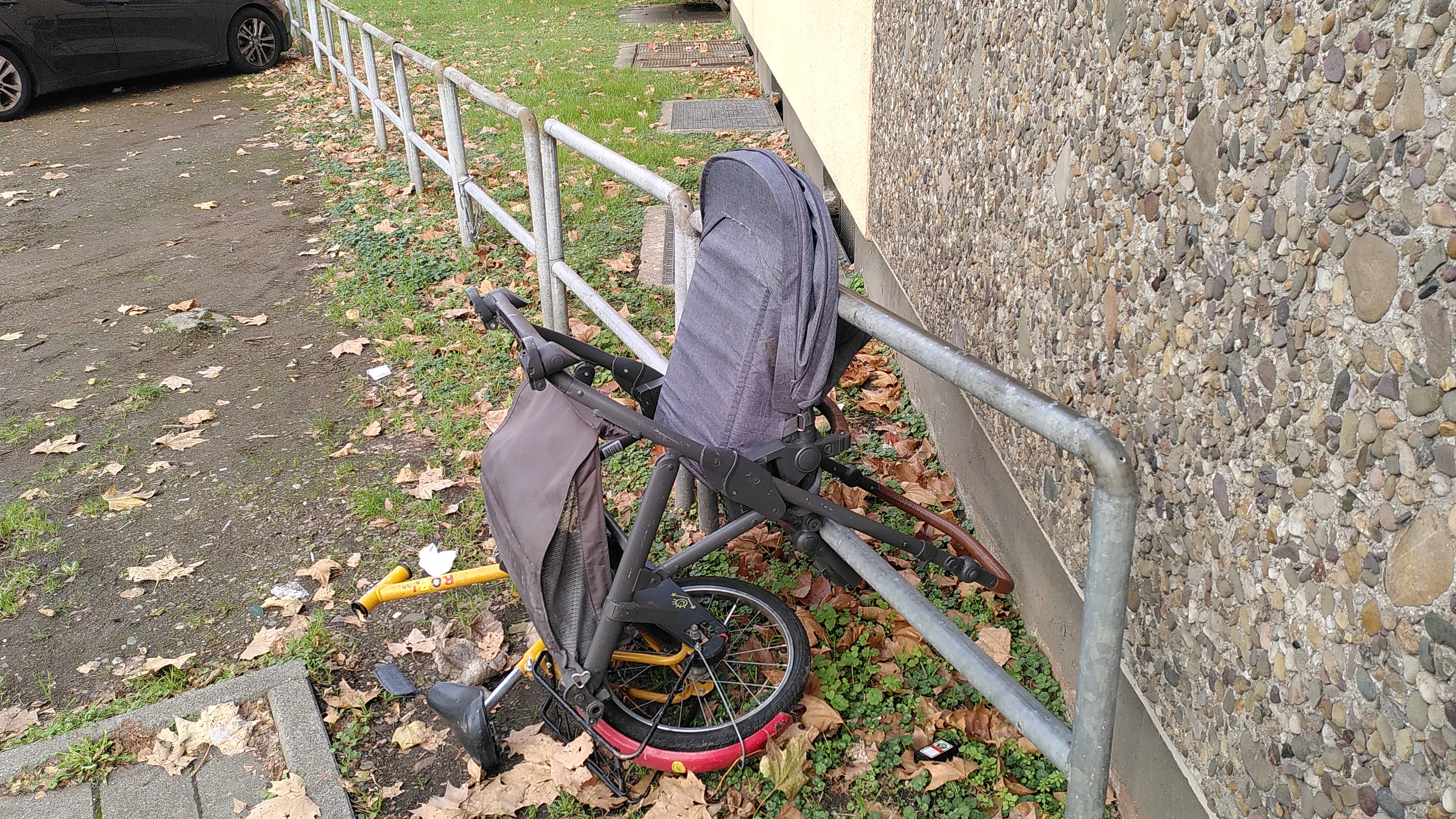 Schrott-Kinderfahrrad und -Kinderwagen vor dem Haus Nr. 100