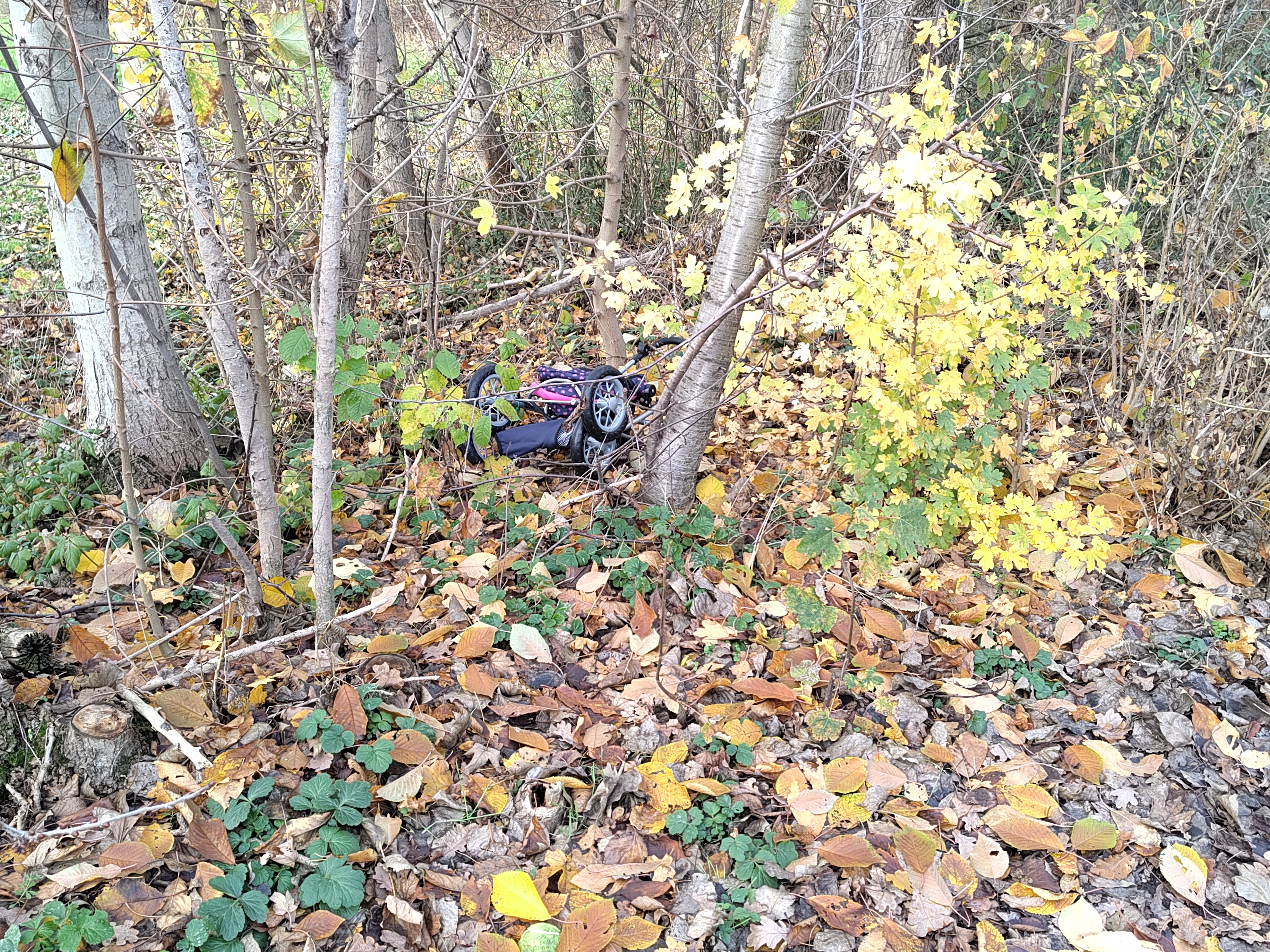 Hier liegt ein Einkaufstrolley im Gebüsch