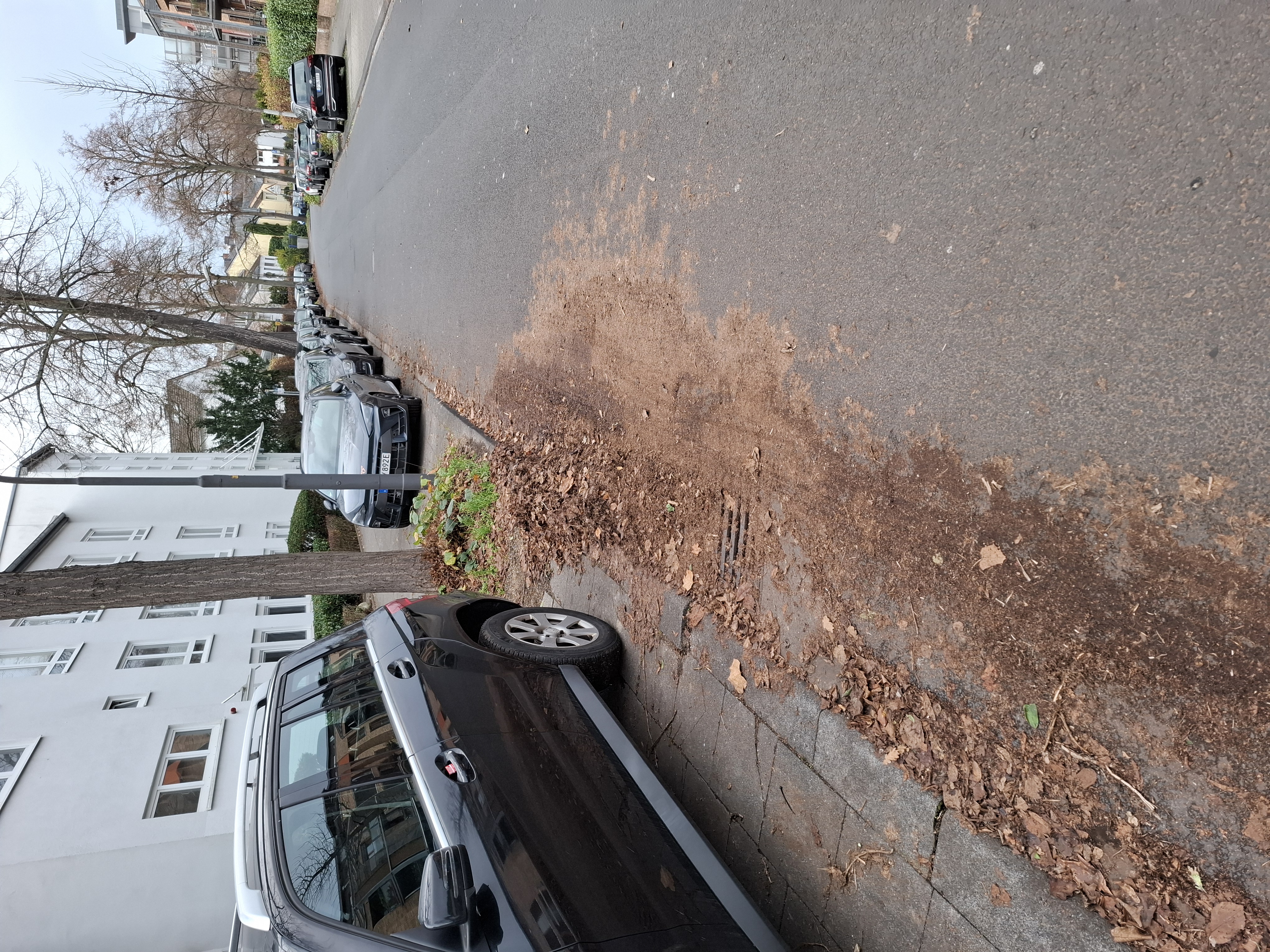 Ein bereits zusammengekehrter Laubhaufen wird vom Autoverkehr wieder "auseinandergefahren" und verursacht dadurch reichlich Dreck in Form einer langen Spur auf der Straße. Bitte abräumen.
