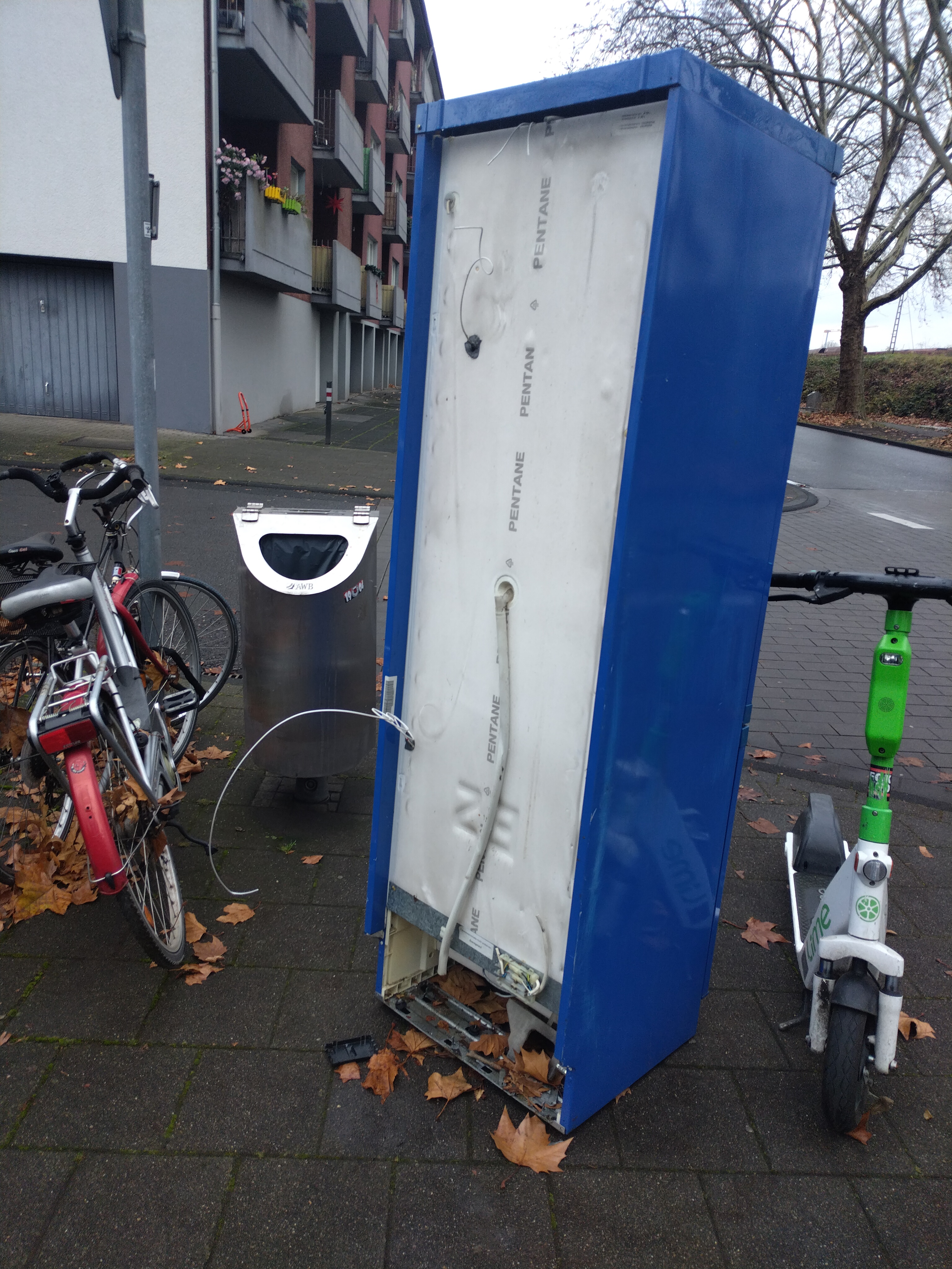 Auf dem Gehweg steht ein illegal abgestellter Kühlschrank.