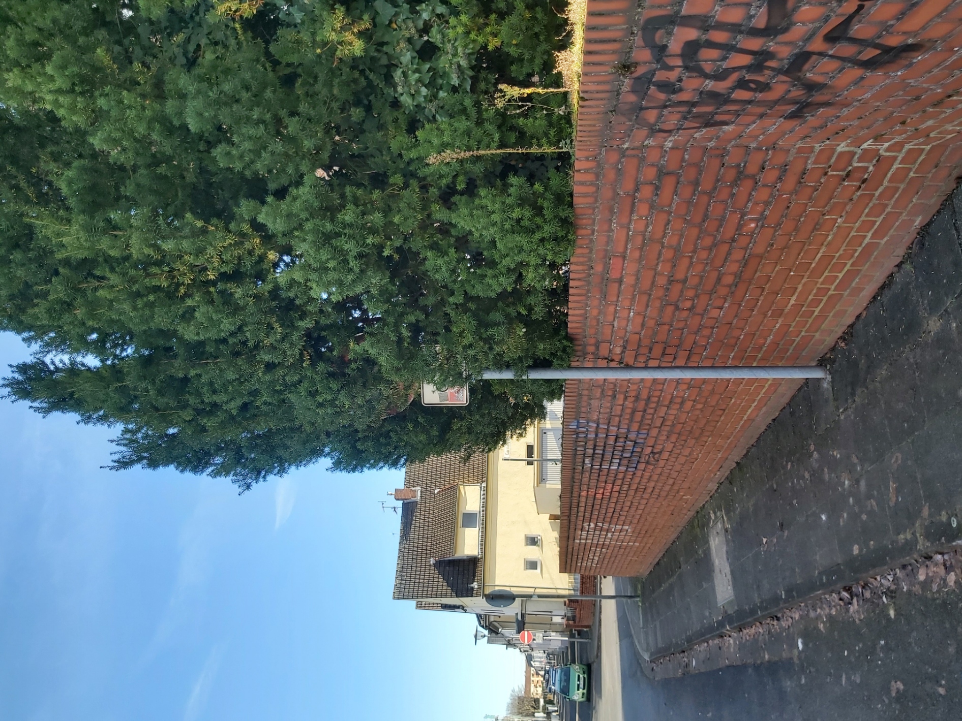 Auf dem Foto ist ein Einbahnstraßenschild nicht zu sehen, da es durch Zweige des auf dem Nachbargrundstück befindlichen Baumes verdeckt wird. Dadurch kommt es häufiger vor, dass Fahrzeuge gegen die Einbahnstraße fahren.