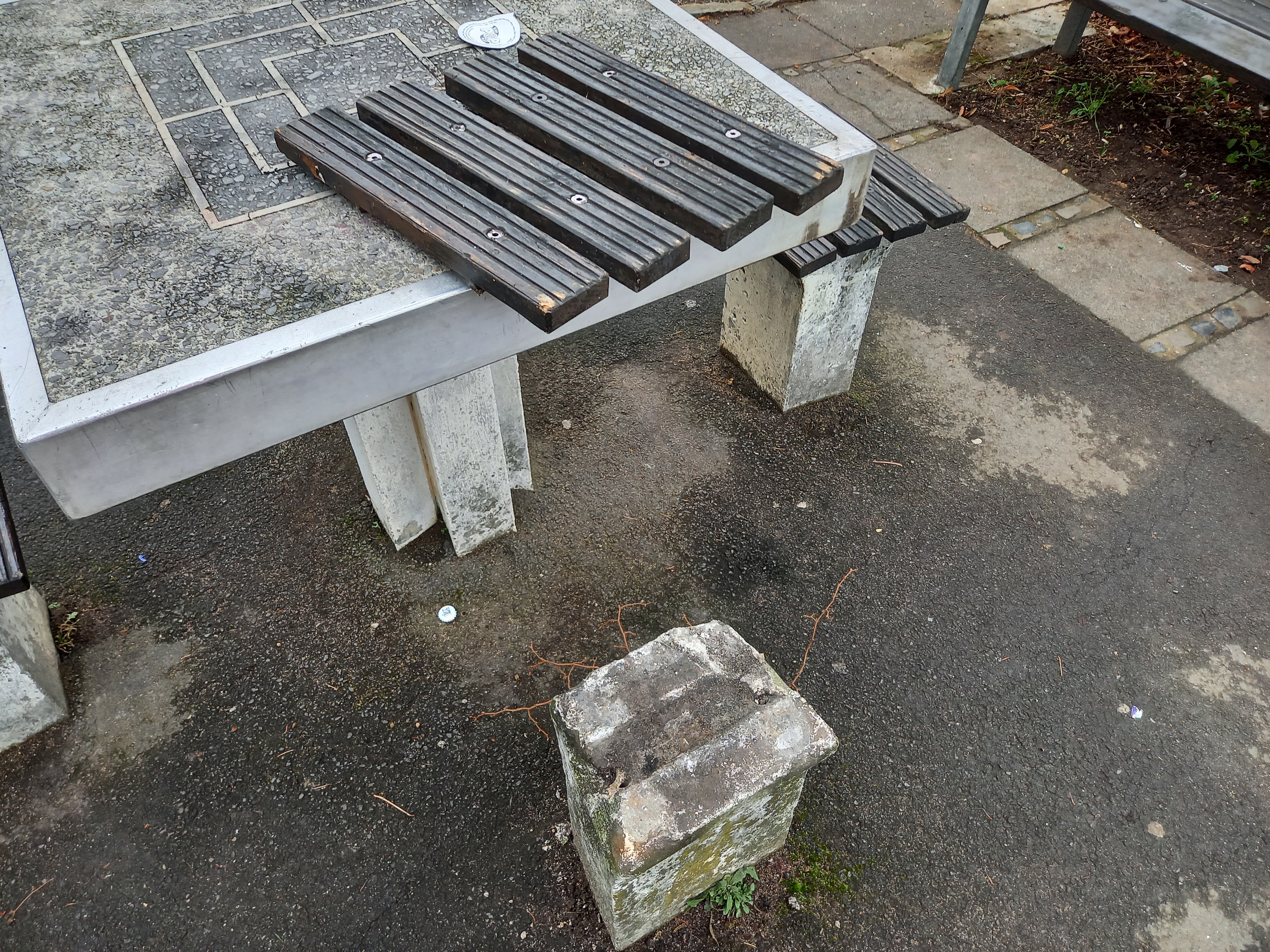 Von einem der 4 Hocker am Tisch dieser Sitzgelegenheit hat sich die Sitzfläche gelöst. Die Schrauben sind weg, das "Brett" ist noch vorhanden