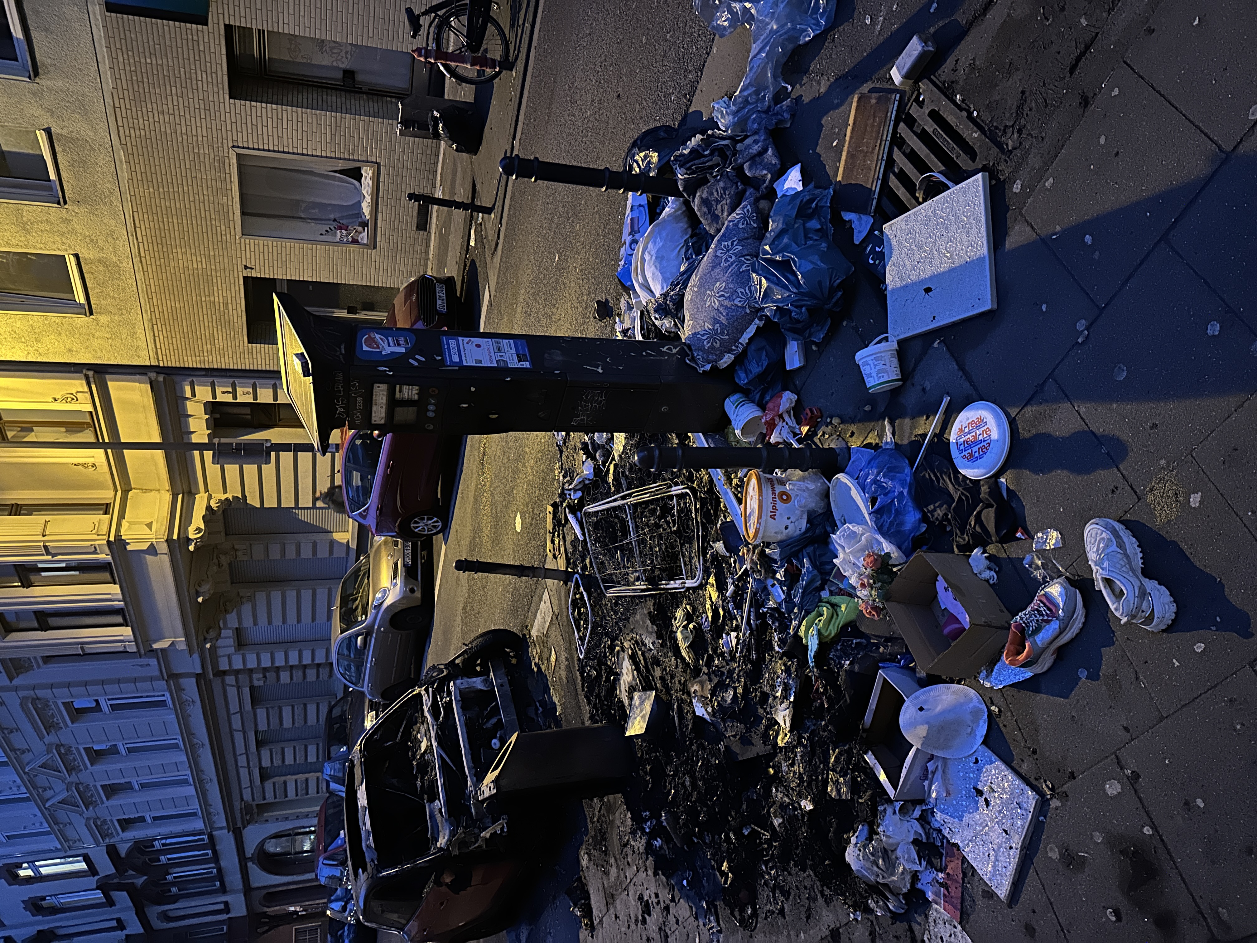 Auf der Trimbornstraße liegt nach einem Brand mit massig (scharfkantigem) Müll quer über den Straßenraum verteilt. Der Gehweg ist mit tausenden Glasscherben übersäht, absolute Verletzungsgefahr!
