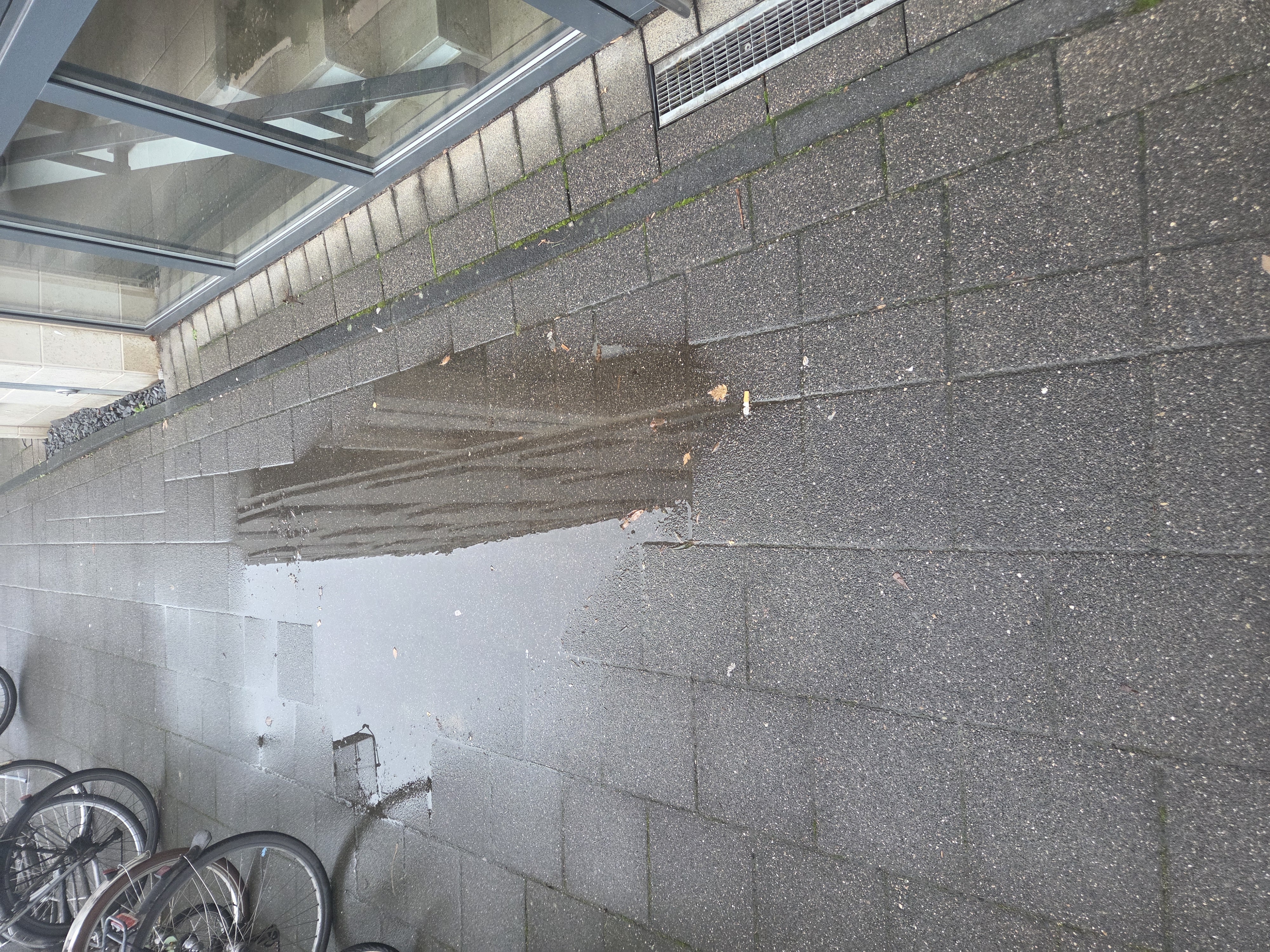 Vor dem Eingang Raderberger Straße 160a ist der Bürgersteig etwas abgesackt. Daher bildet sich bei Regen hier immer eine größere Pfütze, die sich im Anschluss erst langsam durch Verdunstung auflöst. Nach längerem Regen ist die Pfütze so groß, dass man aufgrund der Radständer auf die Straße ausweichen muss.