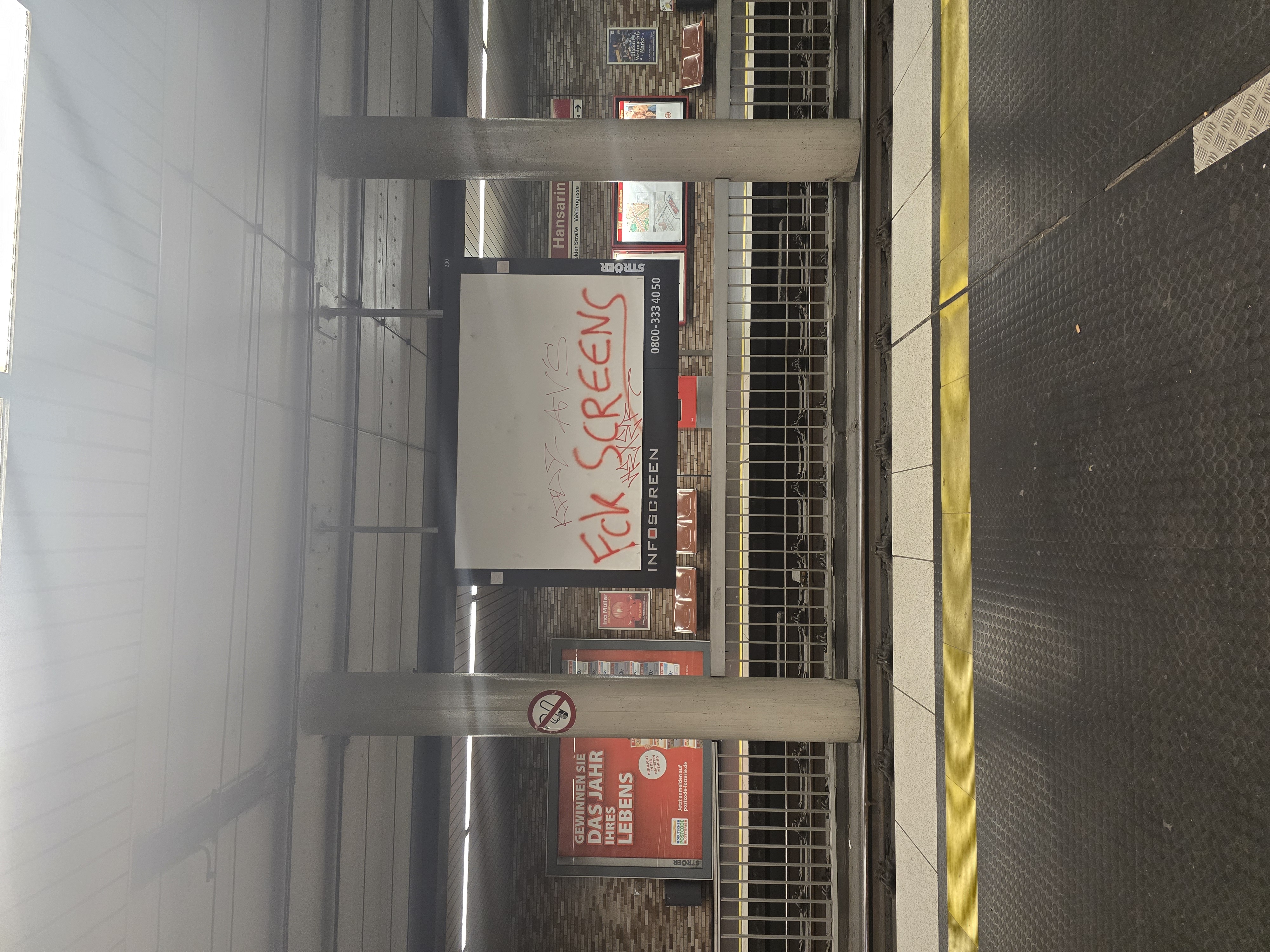 Haltestelle Hansaring. Mehrere Infoscreens seit mehreren Wochen mit "fck screens" verschmiert. Kürzlich neue Schmierereien dazu gekommen.