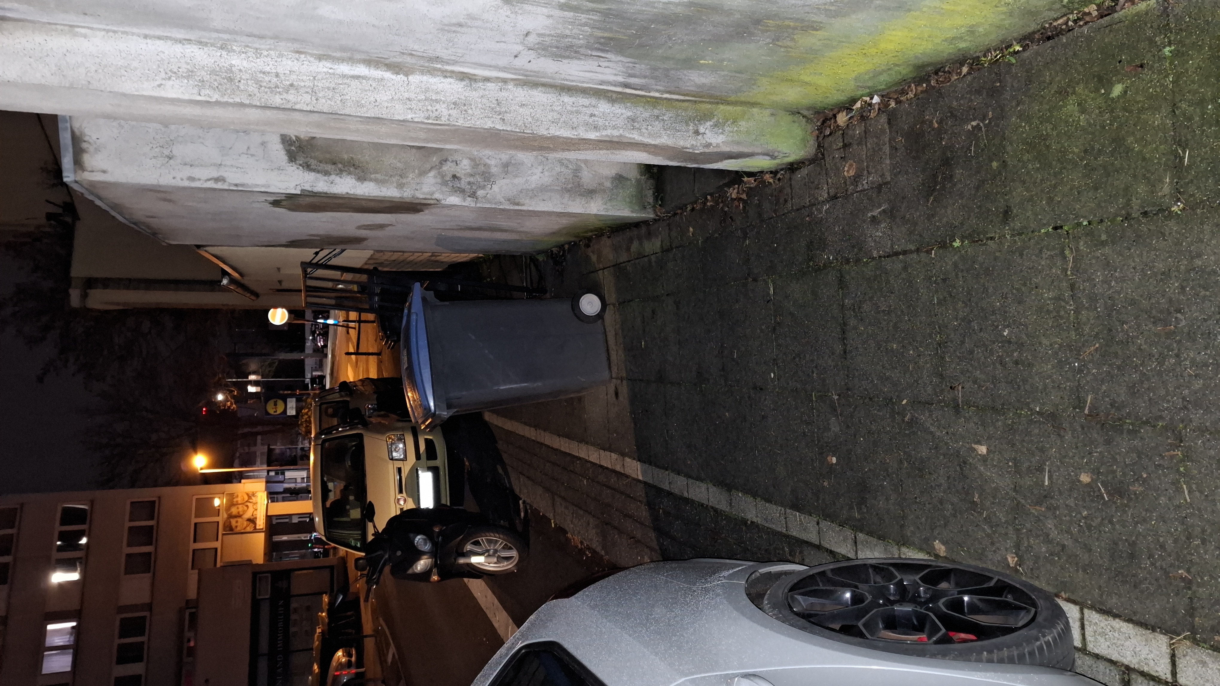 Metallgitter und die Tonnen stehen durchgehend auf dem Bürgersteig. Durchgang nicht möglich.