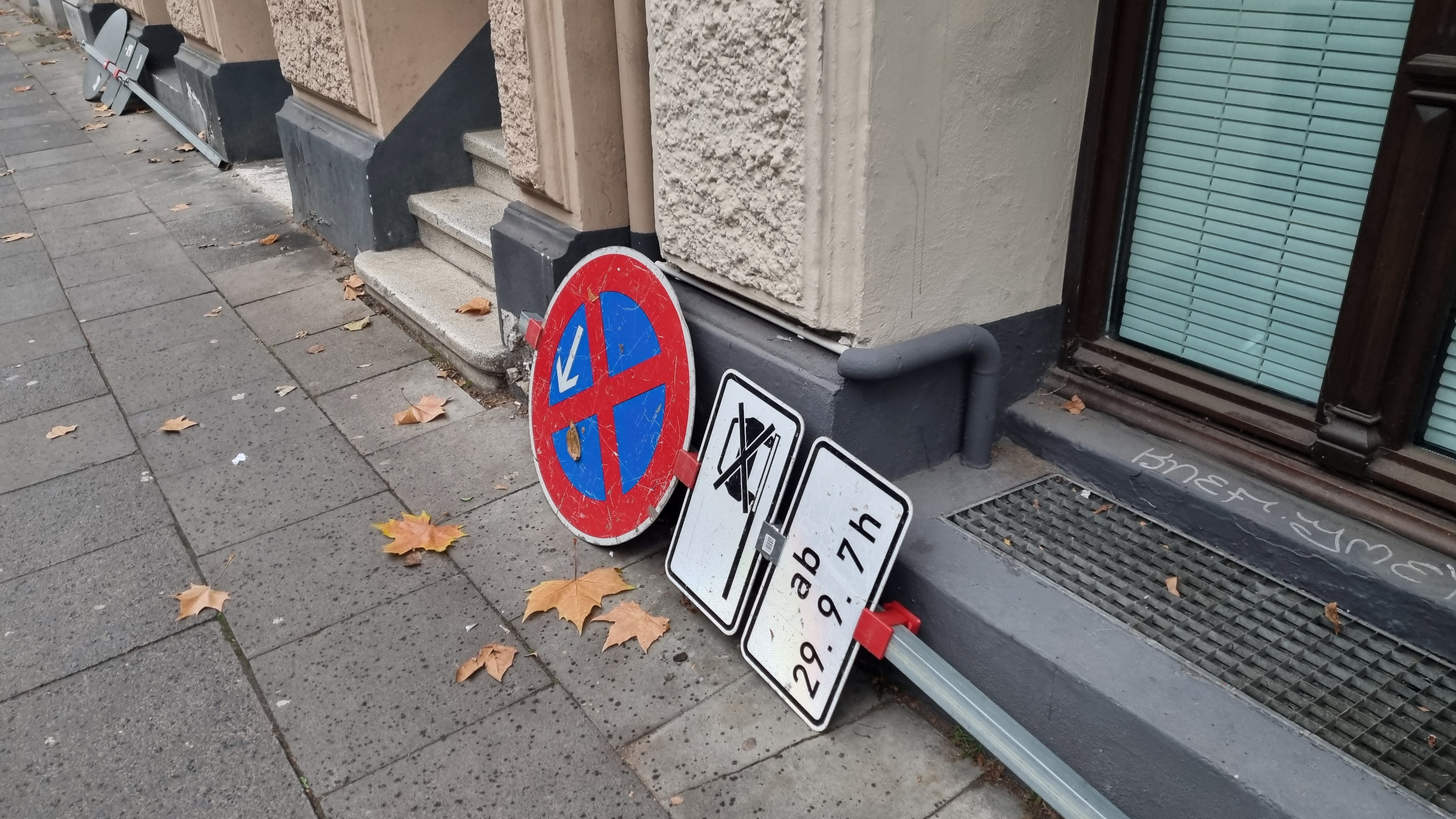 2 Halteverbotsschilder wurden vergessen abzubauen. Ebenso viele Schid-Sockel.