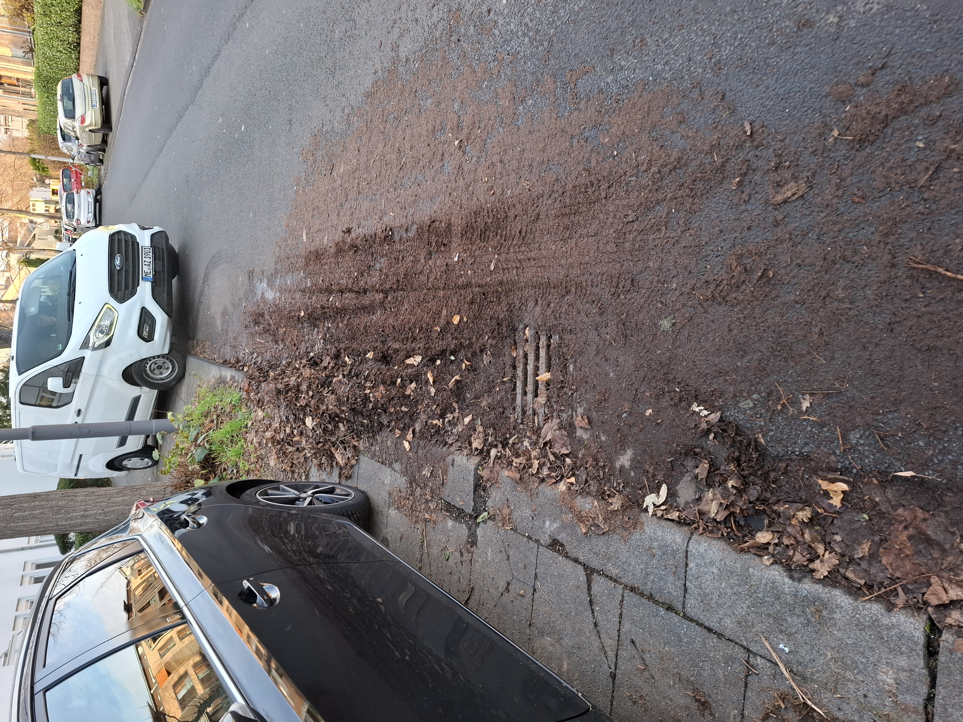 Laubhaufen wird zunehmend "zerfahren", der Dreck verteilt sich über die halbe Straße