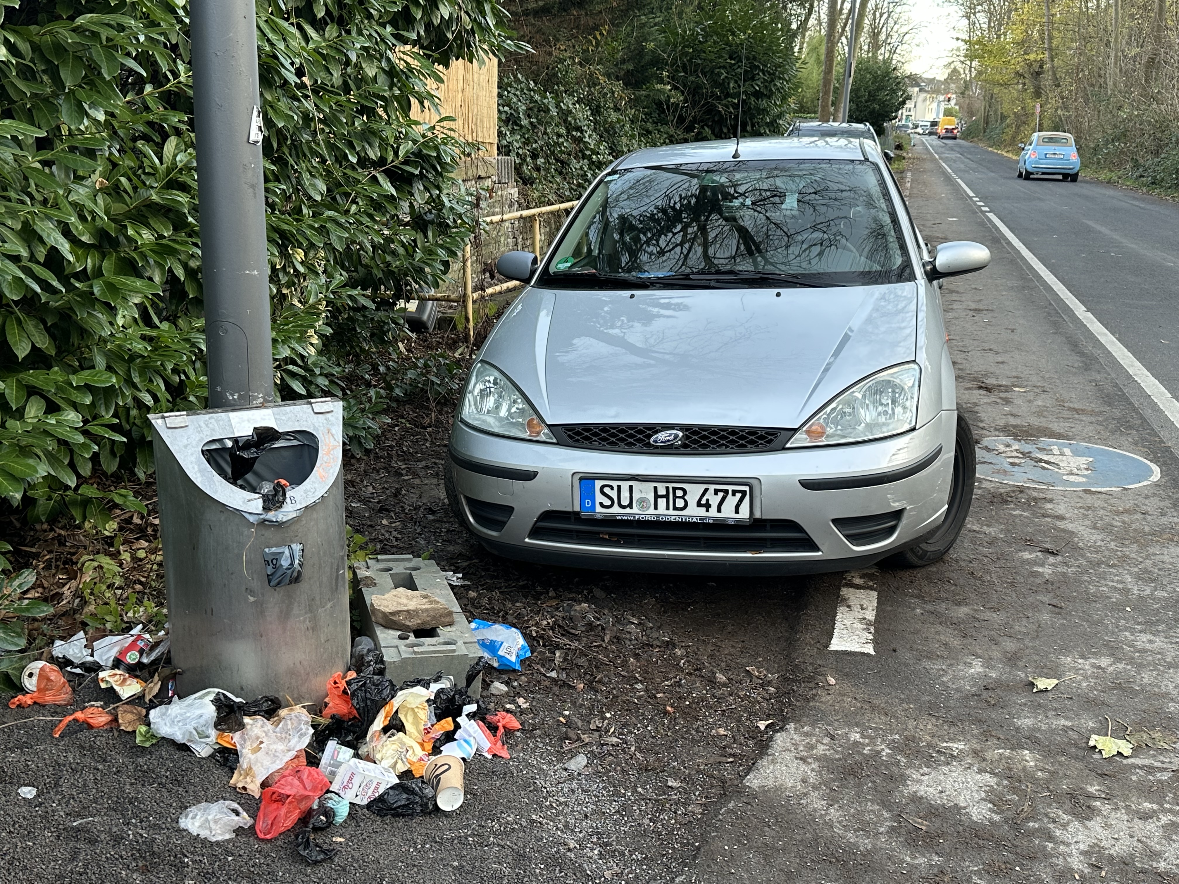 Mülleimer nicht korrekt befestigt. Nicht geleert und übervoll.