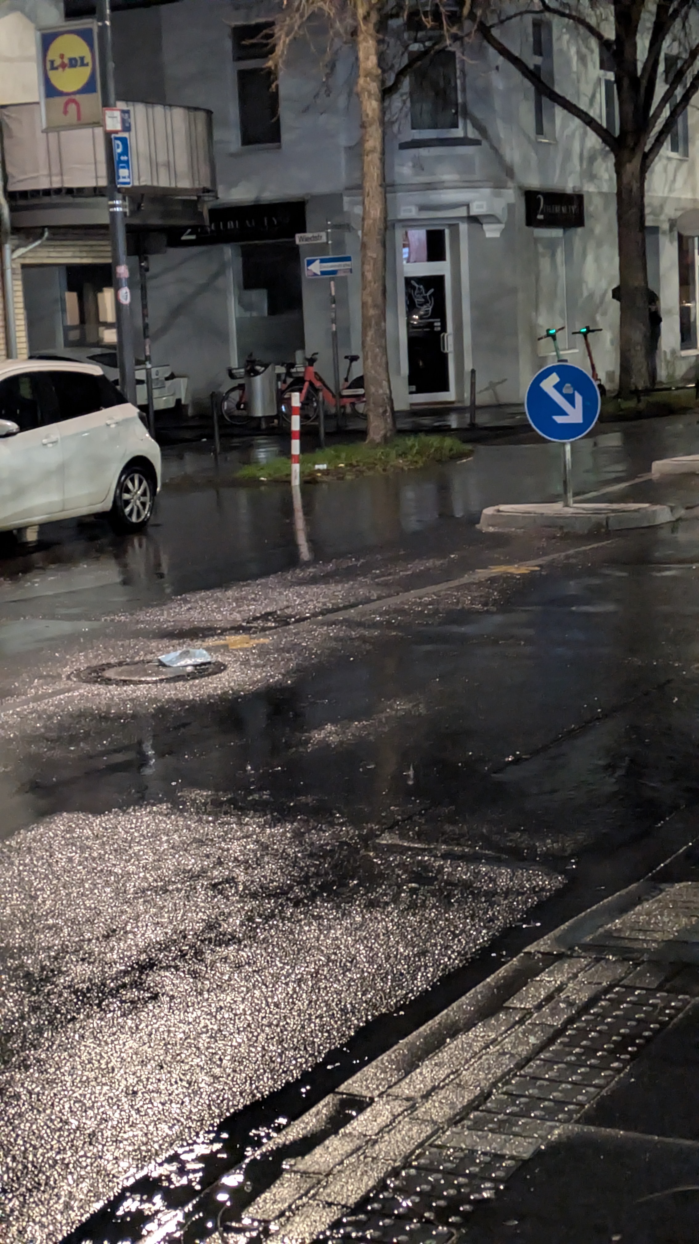 Das Wasser fließt nicht ab, letztes Mal stand es noch zwei Tage nach dem letzten Regen. Dieses Mal ist die Pfütze doppelt so groß während es noch regnet.