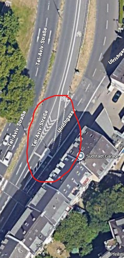 Die Ampelschaltung an der Tel-Aviv-Straße/Ulrichgasse ist für Radfahrer lebensgefährlich. Autofahrer, die von der Tel-Aviv-Straße auf den Zubringer zur Severinsbrücke wollen, übersehen oder ignorieren regelmäßig die rote Ampel, so daß Radfahrer, die sich auf ihre grüne Ampel verlassen und weiter der Tel-Aviv-Straße Richtung Überführung Perlengraben/Severinsbrücke möchten, Gefahr laufen, überfahren zu werden. Mir so heute gegen 7.30h zum wiederholten Mal passiert, trotz grüner Ampel, Beleuchtung und Warnweste. Vorschläge zur Verbesserung: kurzfristig Polizeikontrollen, Haltelinie so verlegen daß Radfahrer nicht von heranpreschenden Autos rücklings überrascht werden, Intervall zwischen "Rot" für Autos und "Grün" für Radfahrer verlängern, Ampelblitzer