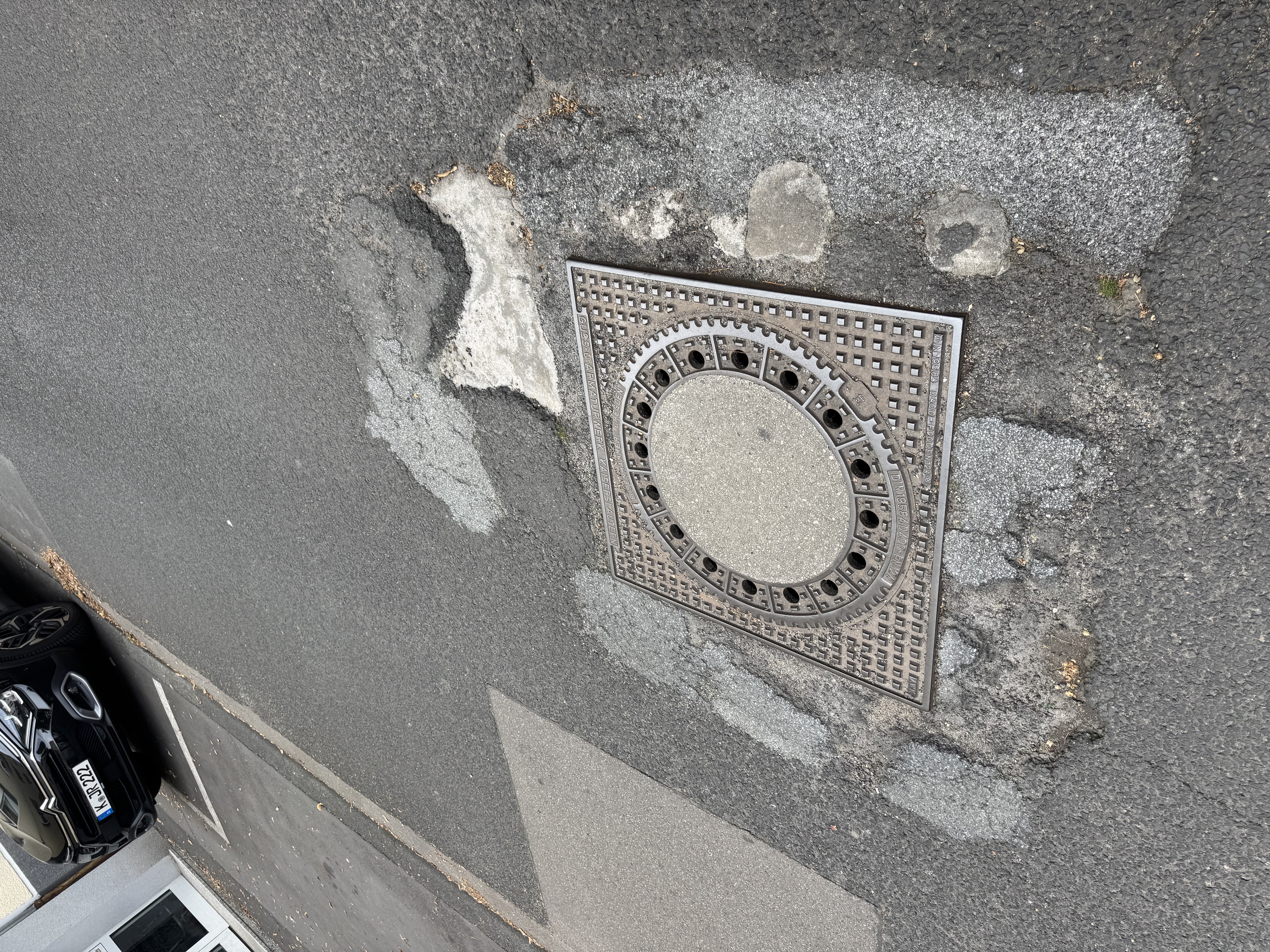 Tiefes Loch, danke Stadt für den Platten am Lastenrad, scharfe Kante hat den Reifen aufgeschlitzt. Unbedingt reparieren