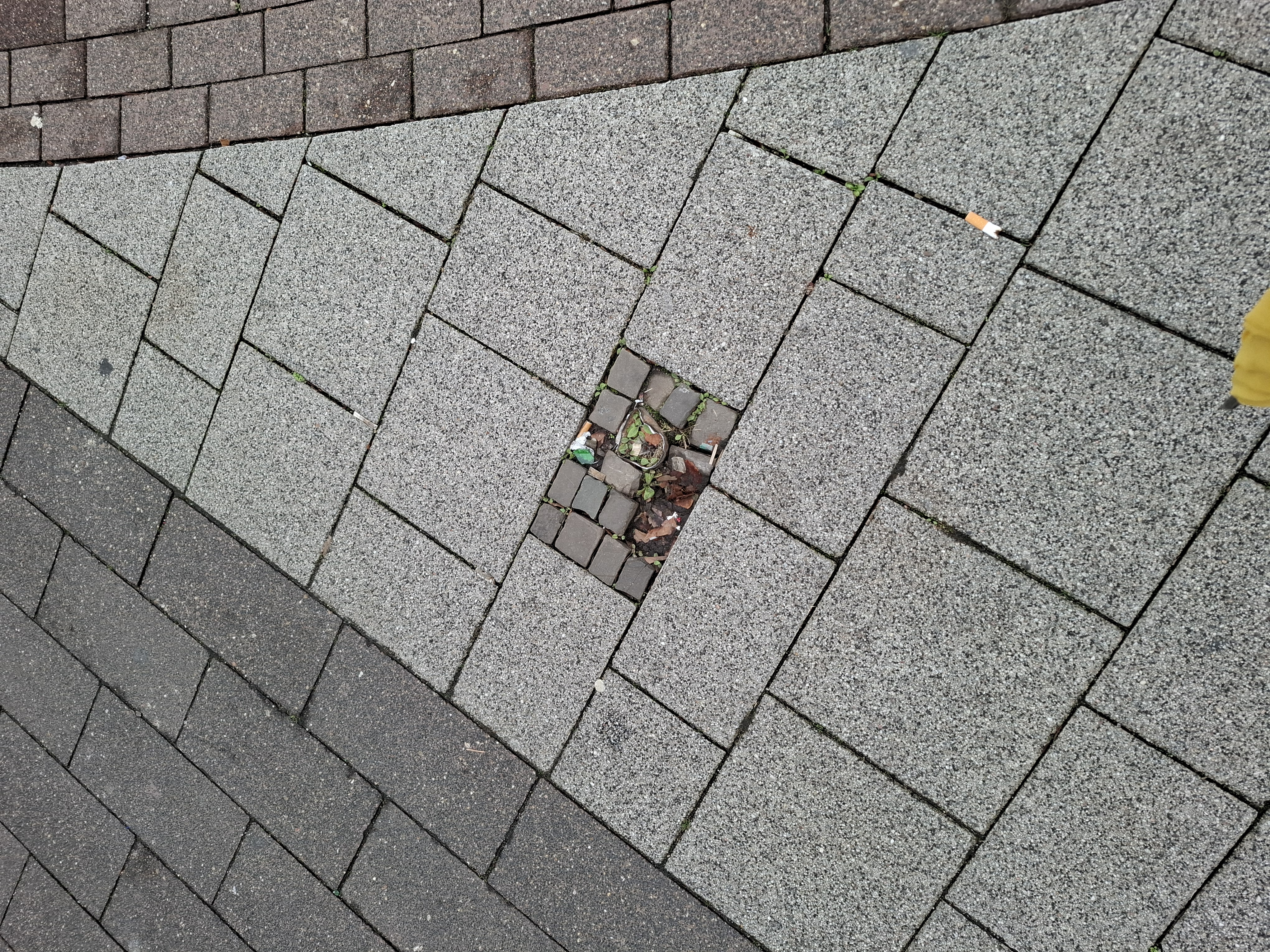 Früher stand hier wohl mal ein Schild, mittlerweile ist es nur noch eine Fehlstelle im Pflaster, in der sich Dreck ansammelt. Bitte mit Pflaster verschließen. Vielen Dank.