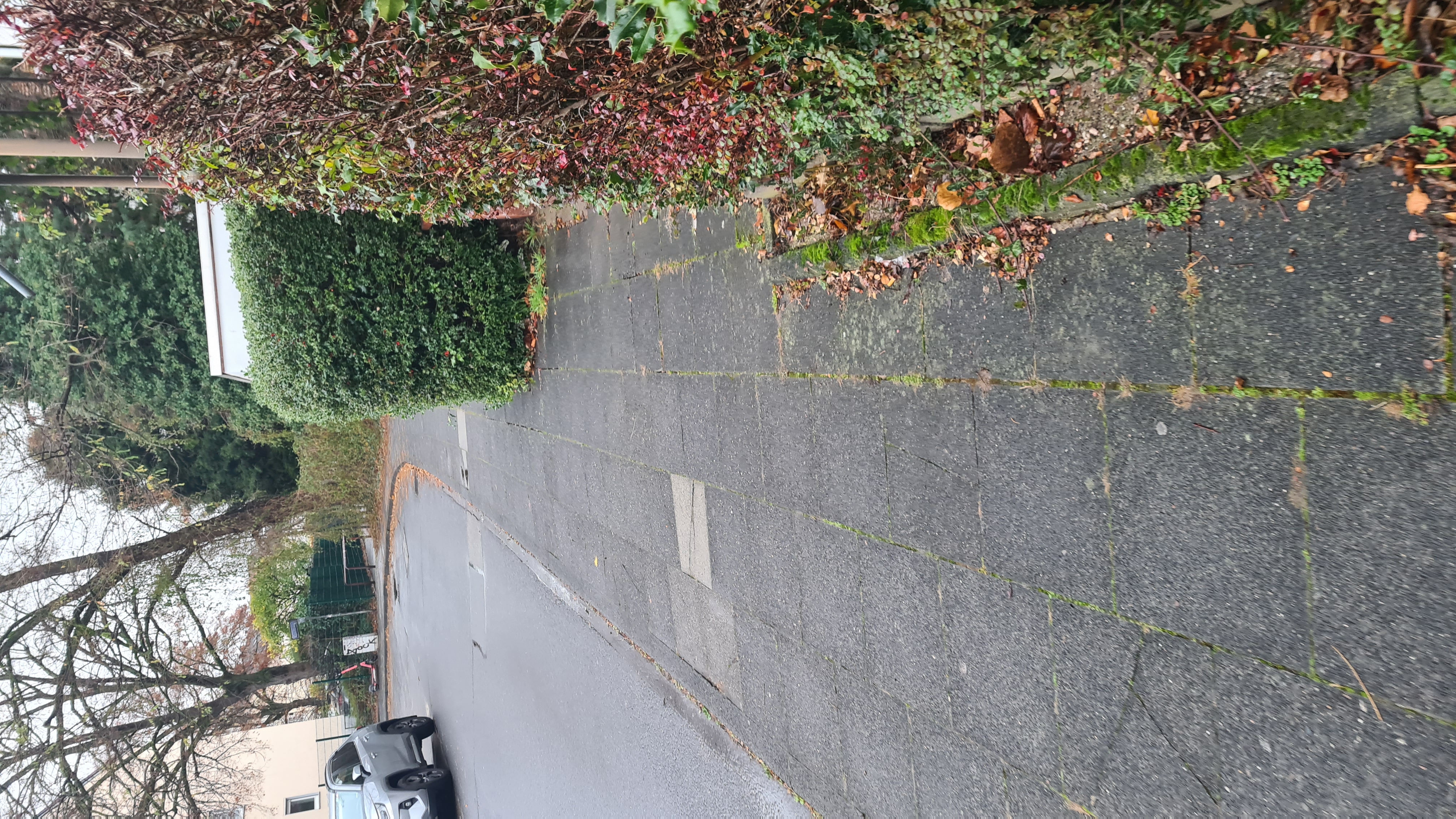 Beim Wilensteinweg wächst eine Hecke auf den Gehweg.