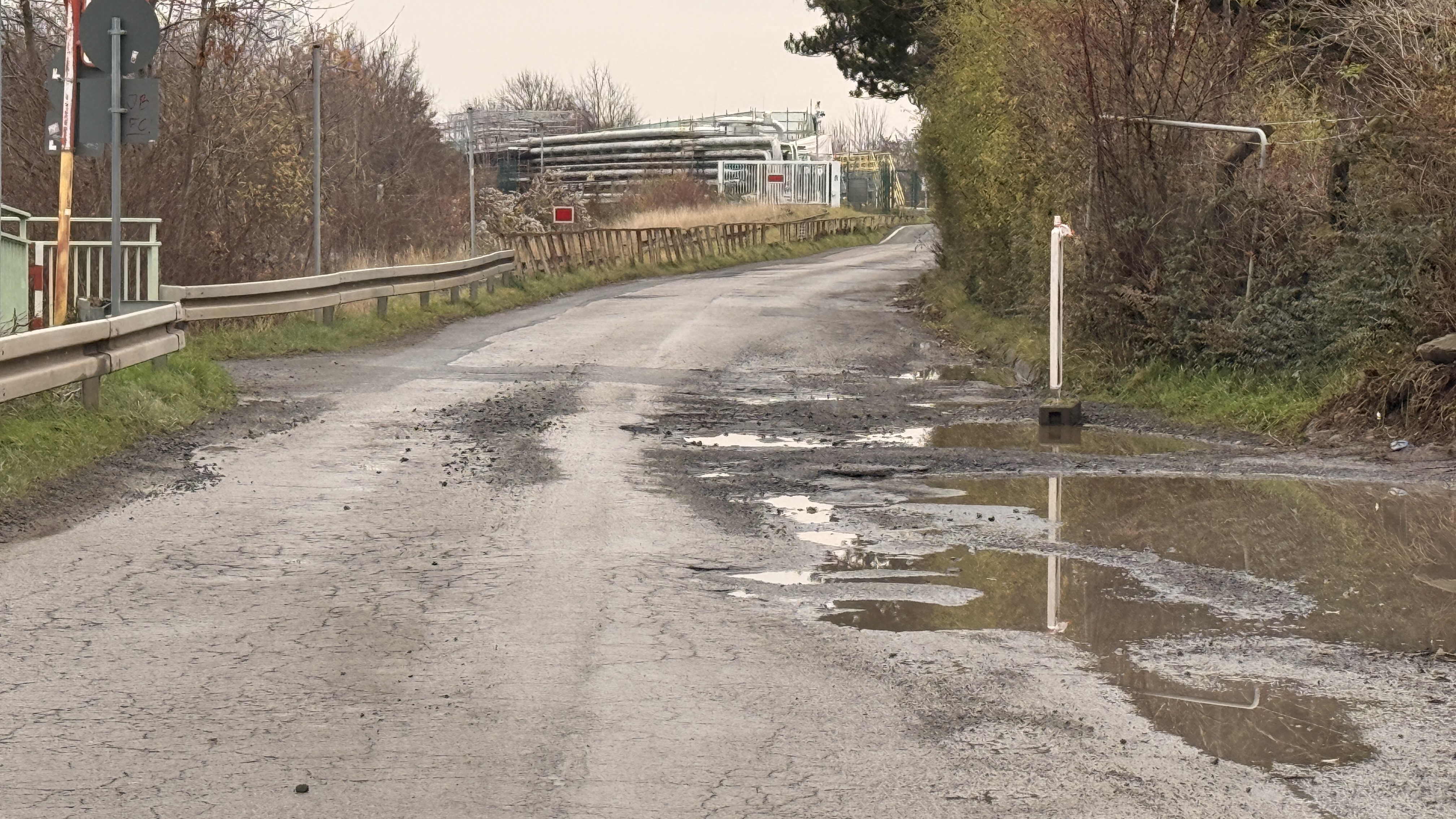Die Straße ist über 10m komplett mit Schlaglöcher übersät!