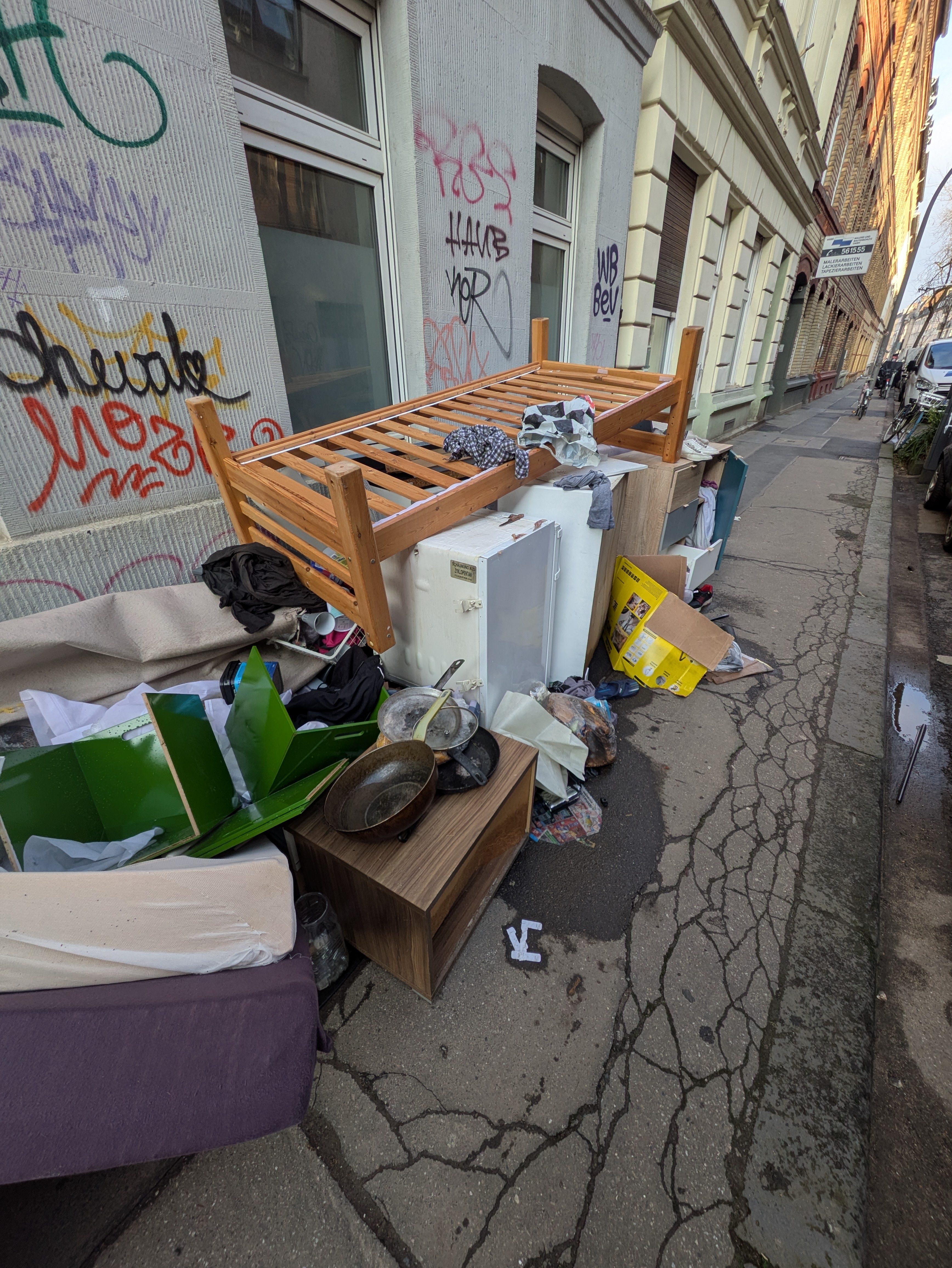 Riesen Müllhaufen aufm Trottoir nach Auszug des Mieters Singh aus der Gutenbergstr. 49. Angeblich hat er Sperrmüll bestellt. Der Müllberg ist jedoch seit Tagen da. Es handelt sich um allerlei Unrat samt Essensresten etc.