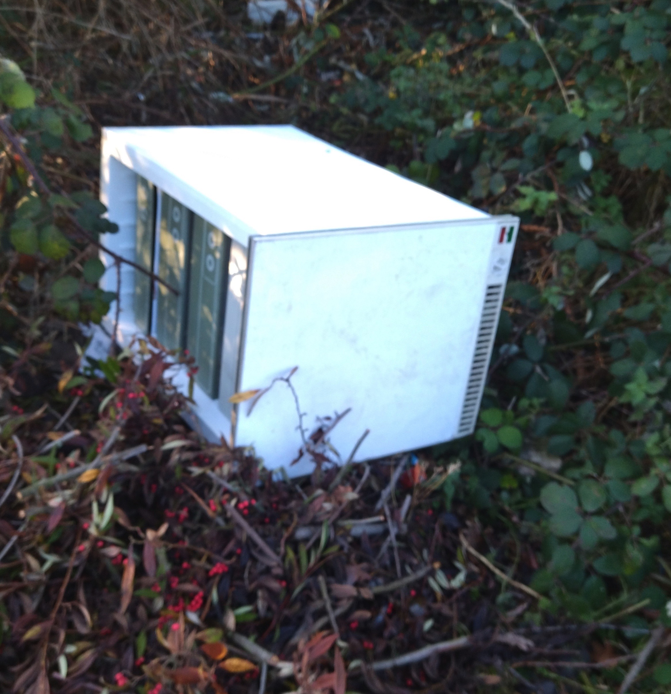 Gefrierschrank o. Tür, abgelegt im Gebüsch " In der Westhover Aue" nahe dem Durchgang für Fußgänger zur Kölner Str.