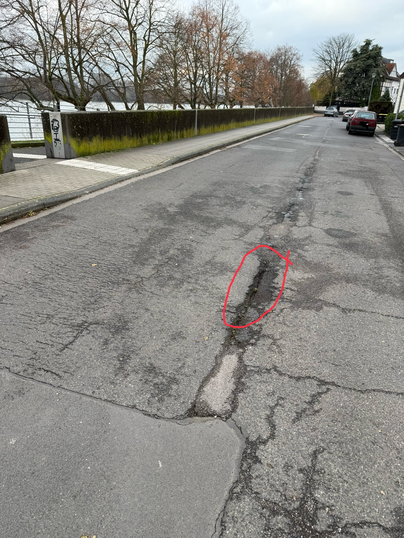 tiefe Längsfurche. Gefahr für Radfahrende beim Abbiegen zum Rhein-Radweg.