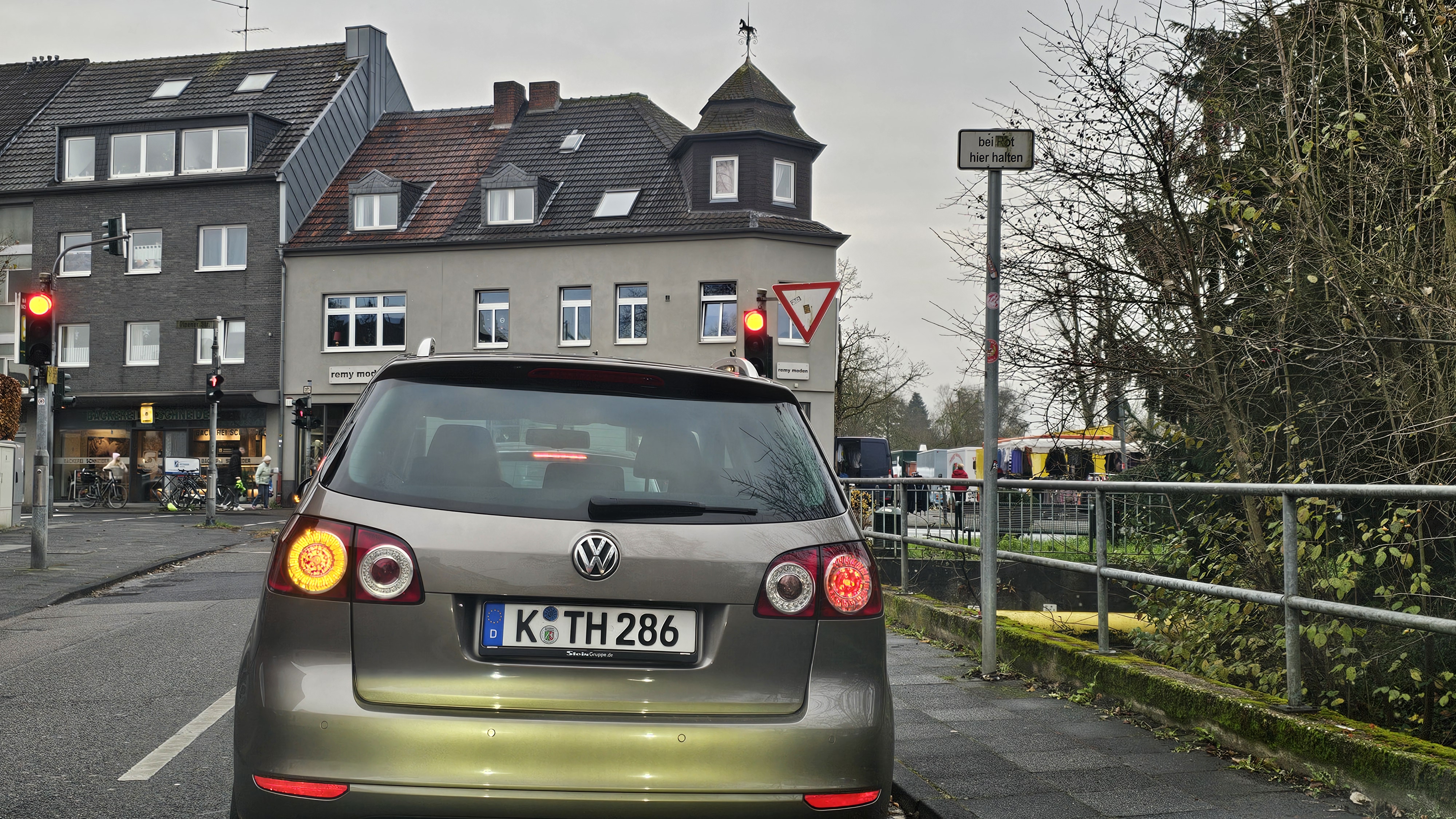 Die Kontaktschleife der vorgezogenen Haltelinie funktioniert nicht und es kommt immer wieder zu Staus, da die Ampel nicht auf grün springt. Fährt man zur vorderen Haltelinie, funktioniert es.
