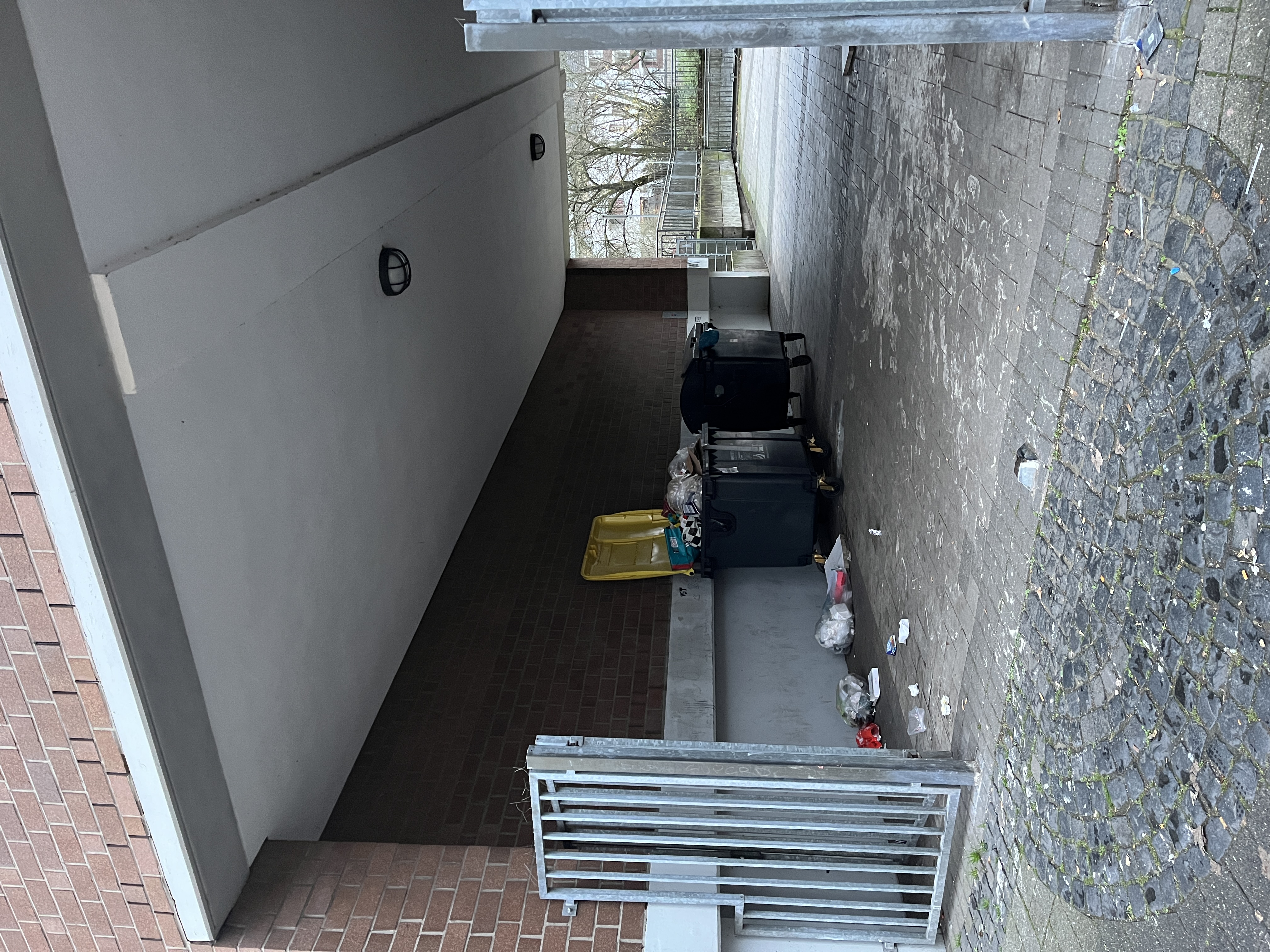 Für diesen Gang muss einen Lösung gefunden werden. Hier steht der Müll ständig. Und die Tonnen Wandern hin und her! Jedes Mal melde ich meinen Anliegen aber es wird nichts gemacht!