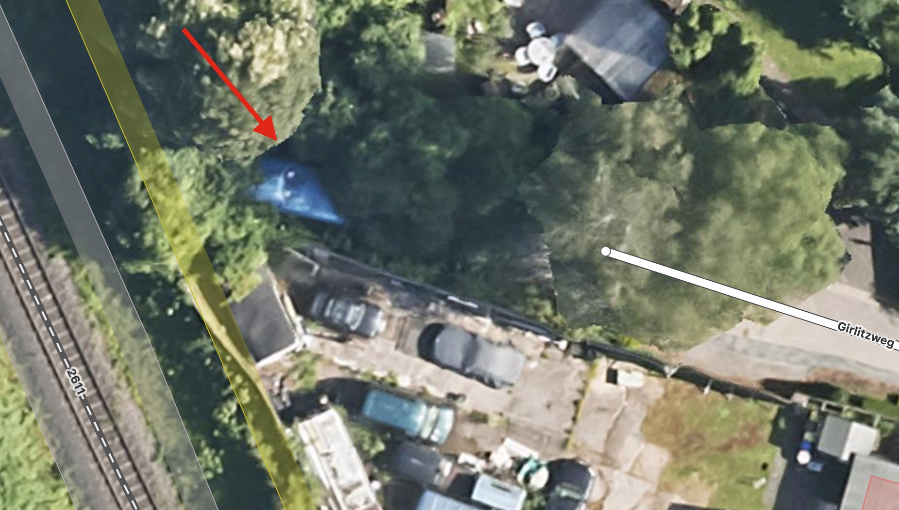 jenseits des pollers im gebüsch ein illegal abelagertes fahrzeug mit blauer plane abgedeckt, siehe auch luftbild In Bearbeitung Schrott-Kfz Girlitzweg 47 50829 Köln Deutschland Statusvermerke Das Anliegen wurde erstellt. Neu Sa., 06.12.2025 - 17:31
