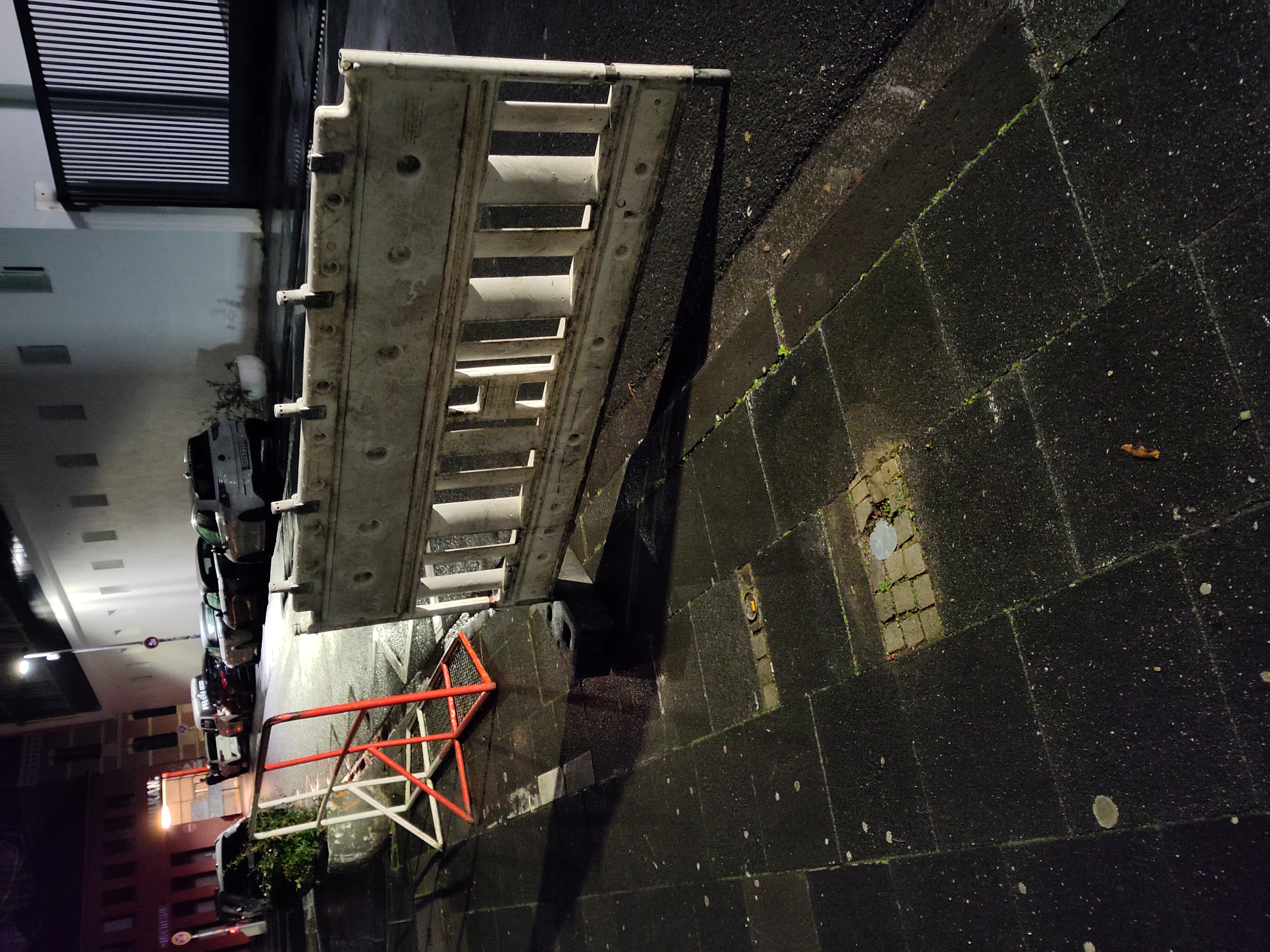 Hier stehen seit Monaten zwei Absperrungen einer alten Baustelle. Wie man auf dem Foto sieht, werden sie immer wieder verschoben oder auf die Straße gestellt. Teilweise muss man auf die Straße um sie zu umgehen.