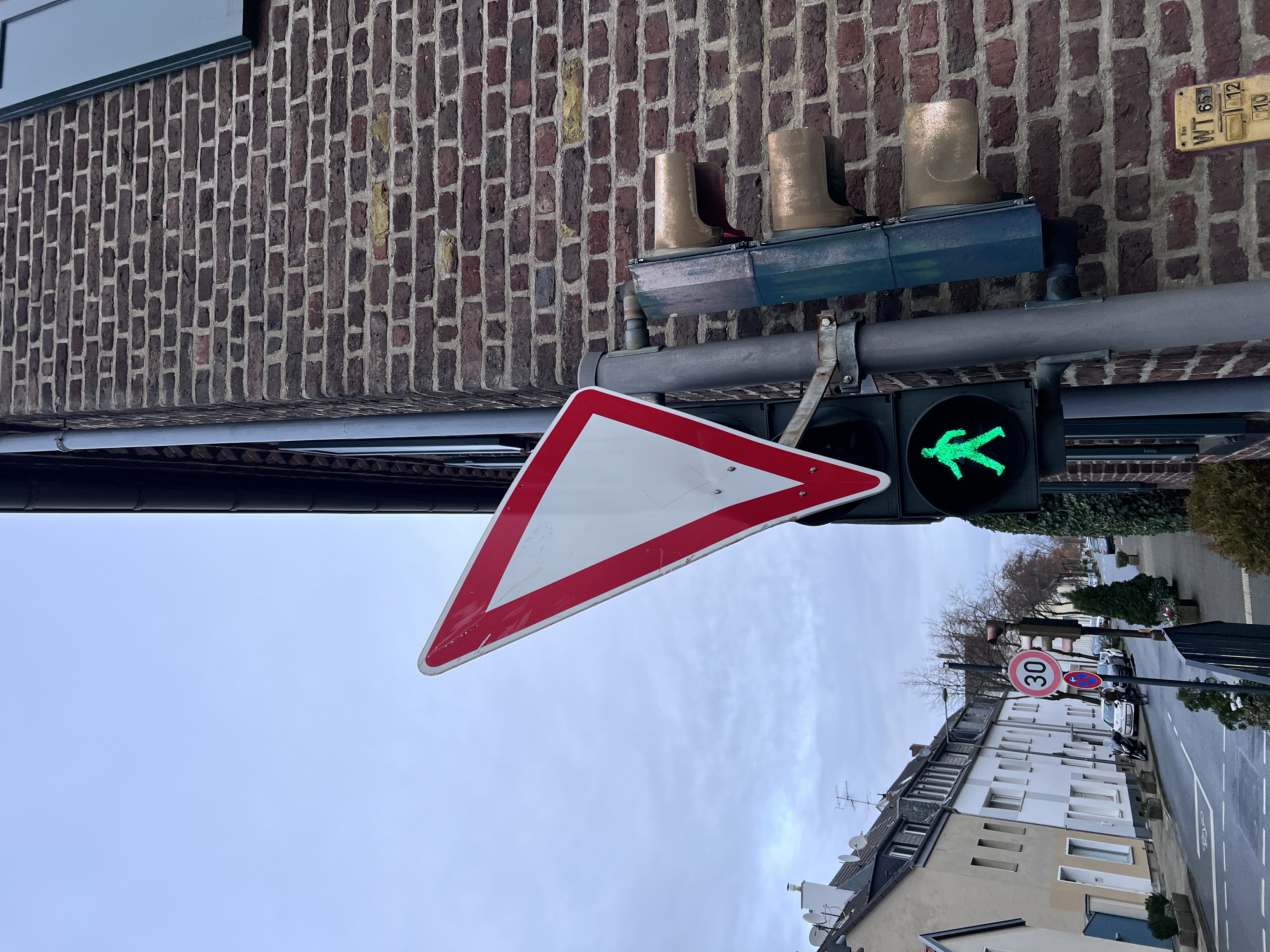 Das Vorfahrtsschild ist verbogen und versperrt den Blick auf die Ampel. Die Rotphase ist für Kinder nicht zu erkennen. Die Ampel ist auf dem Schulweg zur Grundschule und zum Kindergarten.