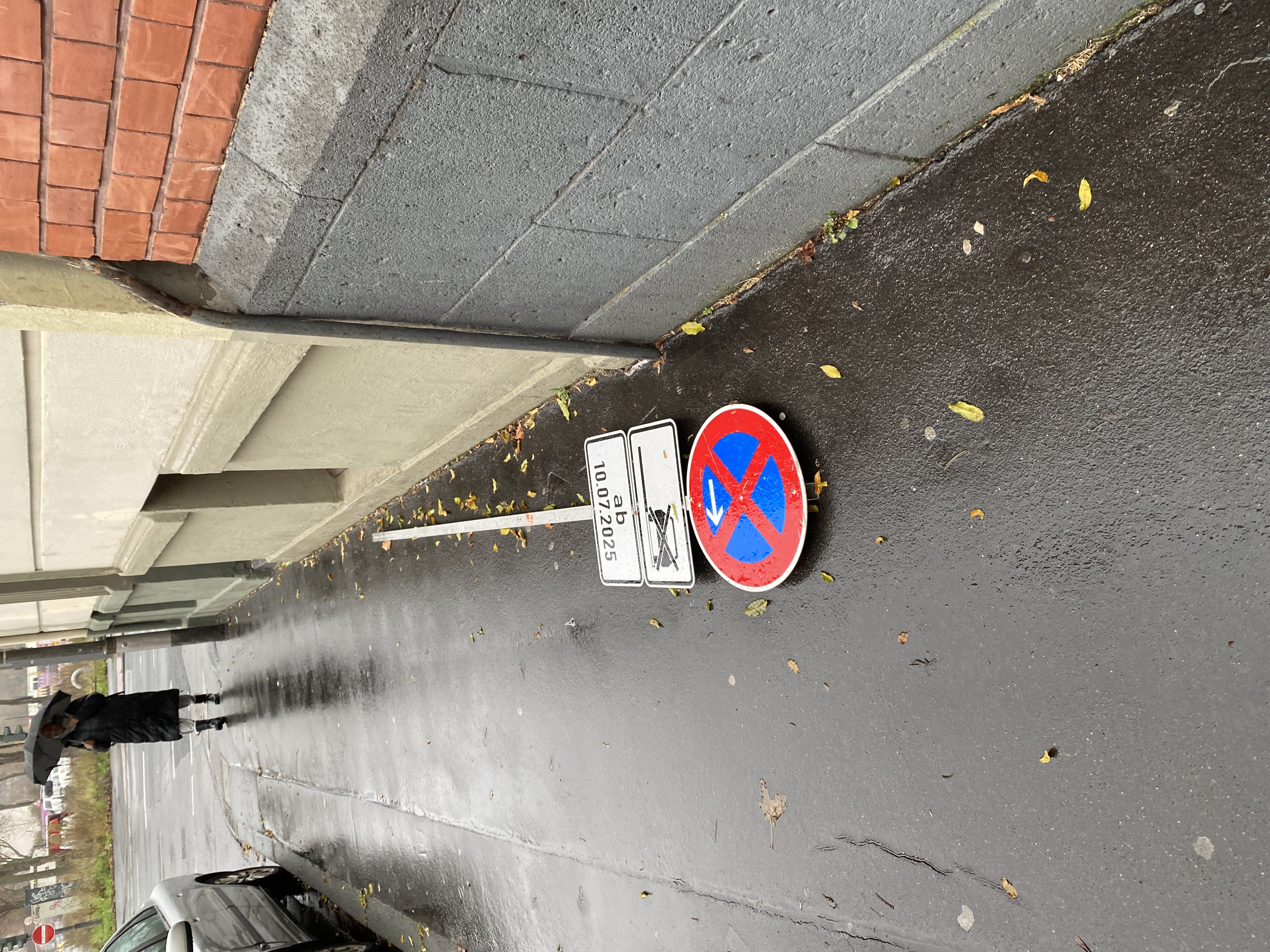 herumliegendes Verkehrsschild blockiert Bürgersteig.