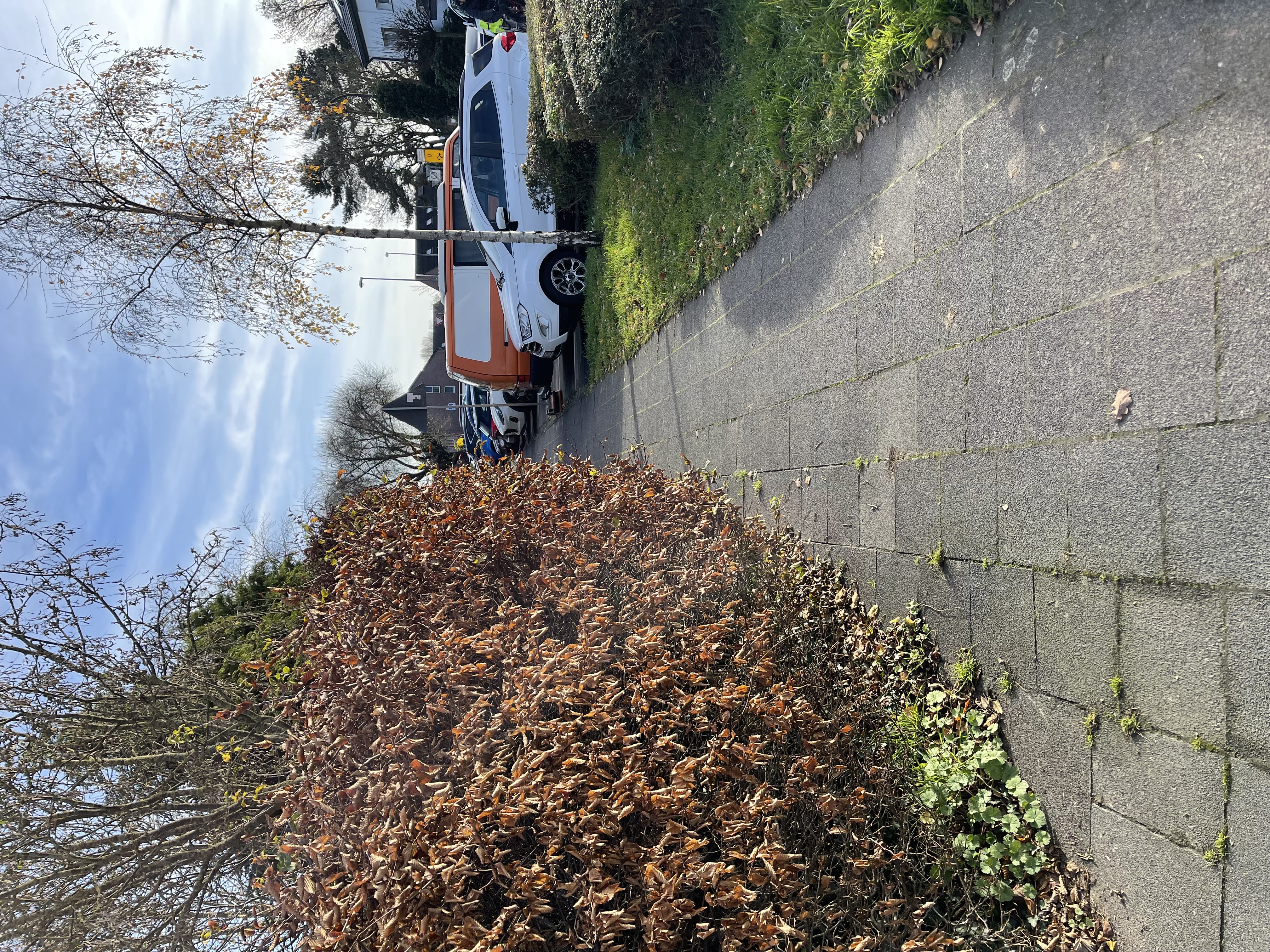 Gehweg (Schuleeg, Weg zur Physiotherapie, zum Bäcker, zur Schule, zur Kita ist halb von Hecke überwuchert