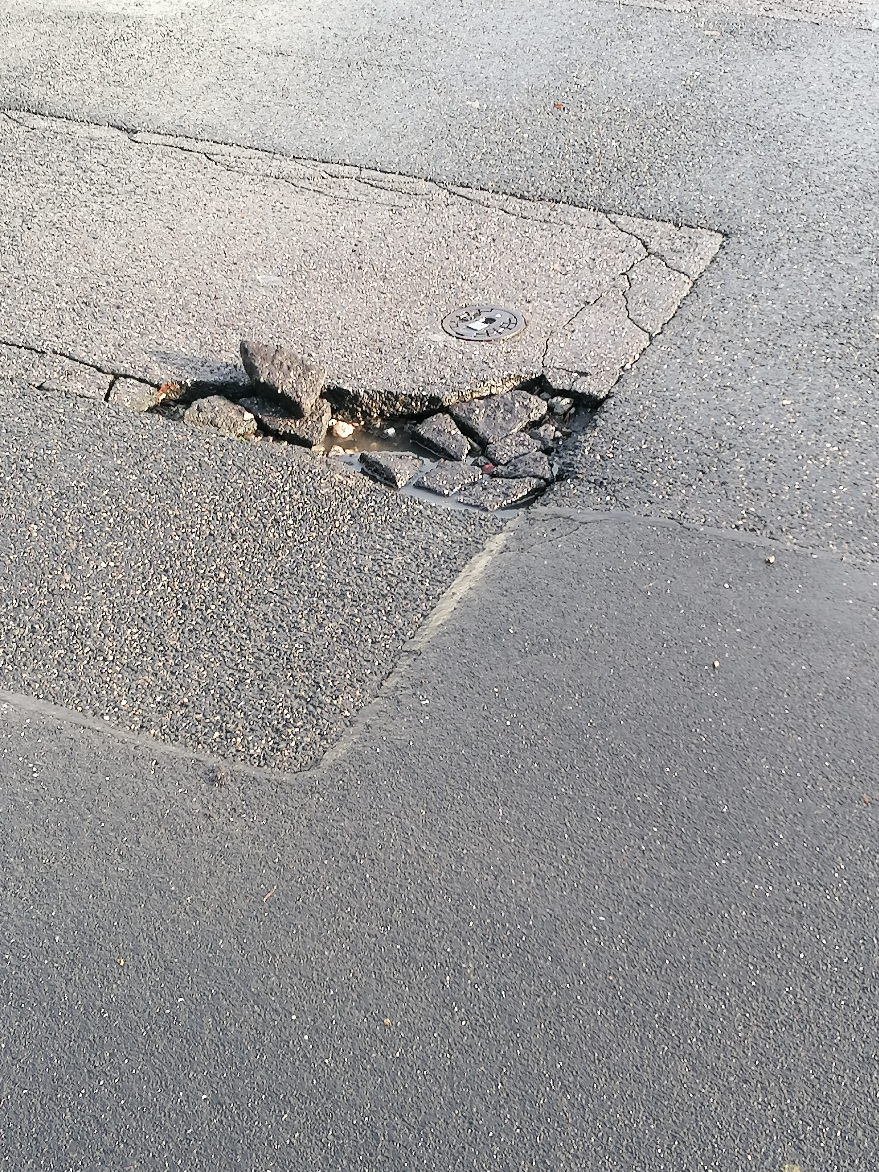 Defekte Straßendecke auf Höhe der Margaretenstr. 34 in Libur. Große Unfallgefahr für Zweiradfahrer.