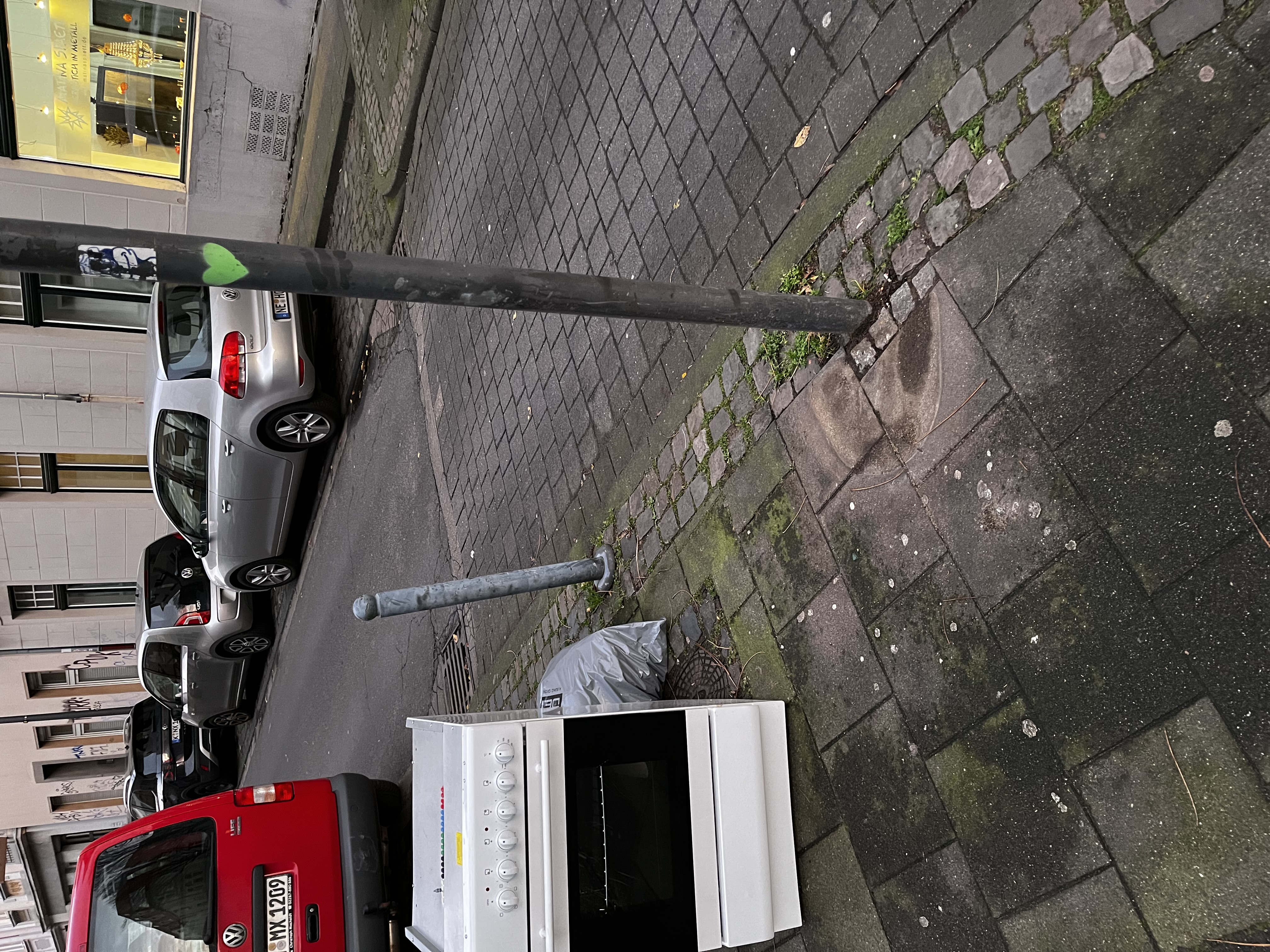 Wo bis vor ein paar Tagen noch ein städtischer (immer gut genutzter, also benötigter) Papierkorb hing, steht jetzt eine Waschmaschine. Da ich vermute, es handelt sich nicht um eine Kunstauktion mit Bezug auf die Verwahrlosung Kölns, ist es wohl einfach nur Dreck. Plus ein geklauter Papierkorb.