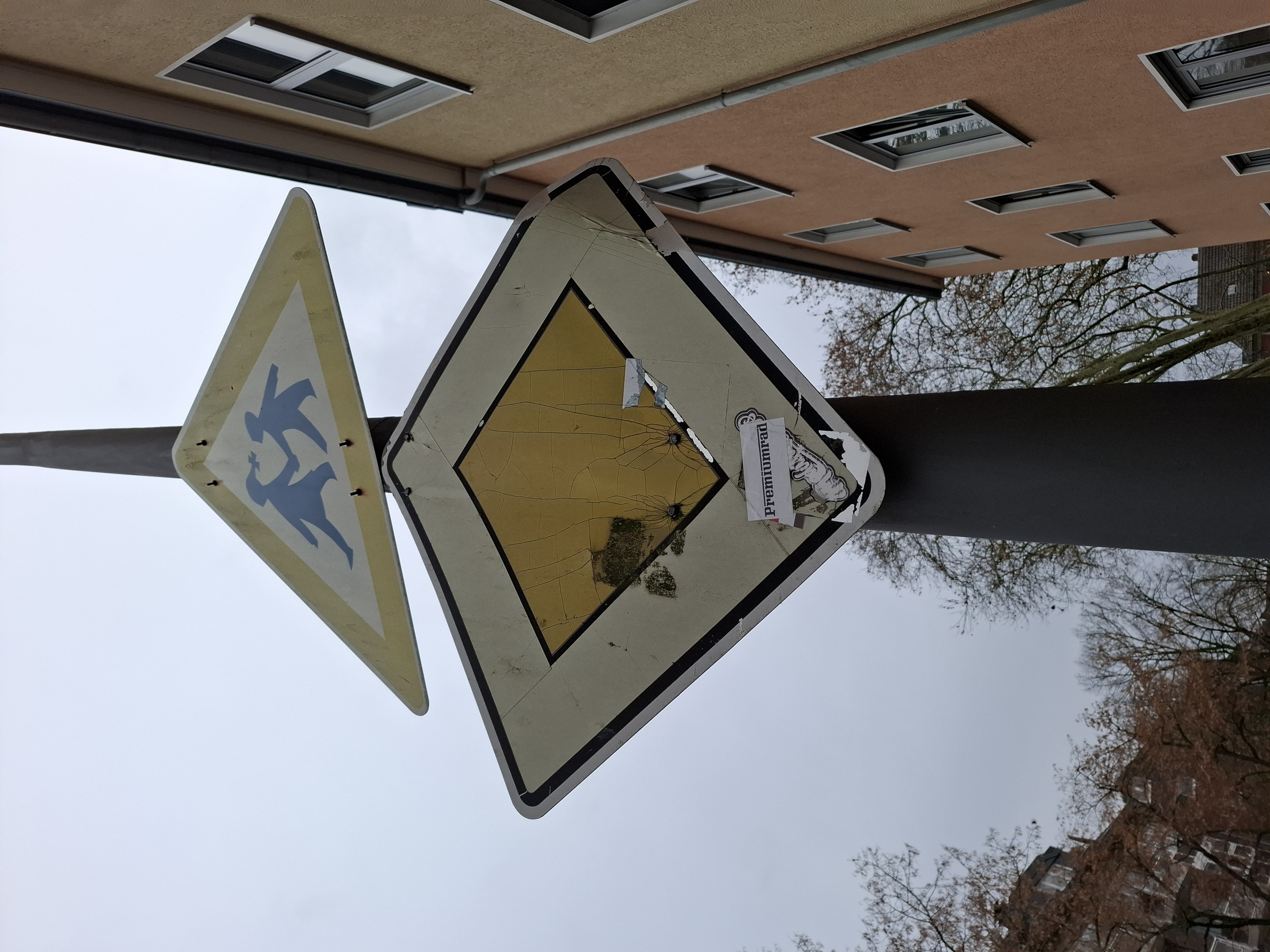 Vorfahrtsstraßenchild in bemitleidenswertem Zustand, bitte austauschen